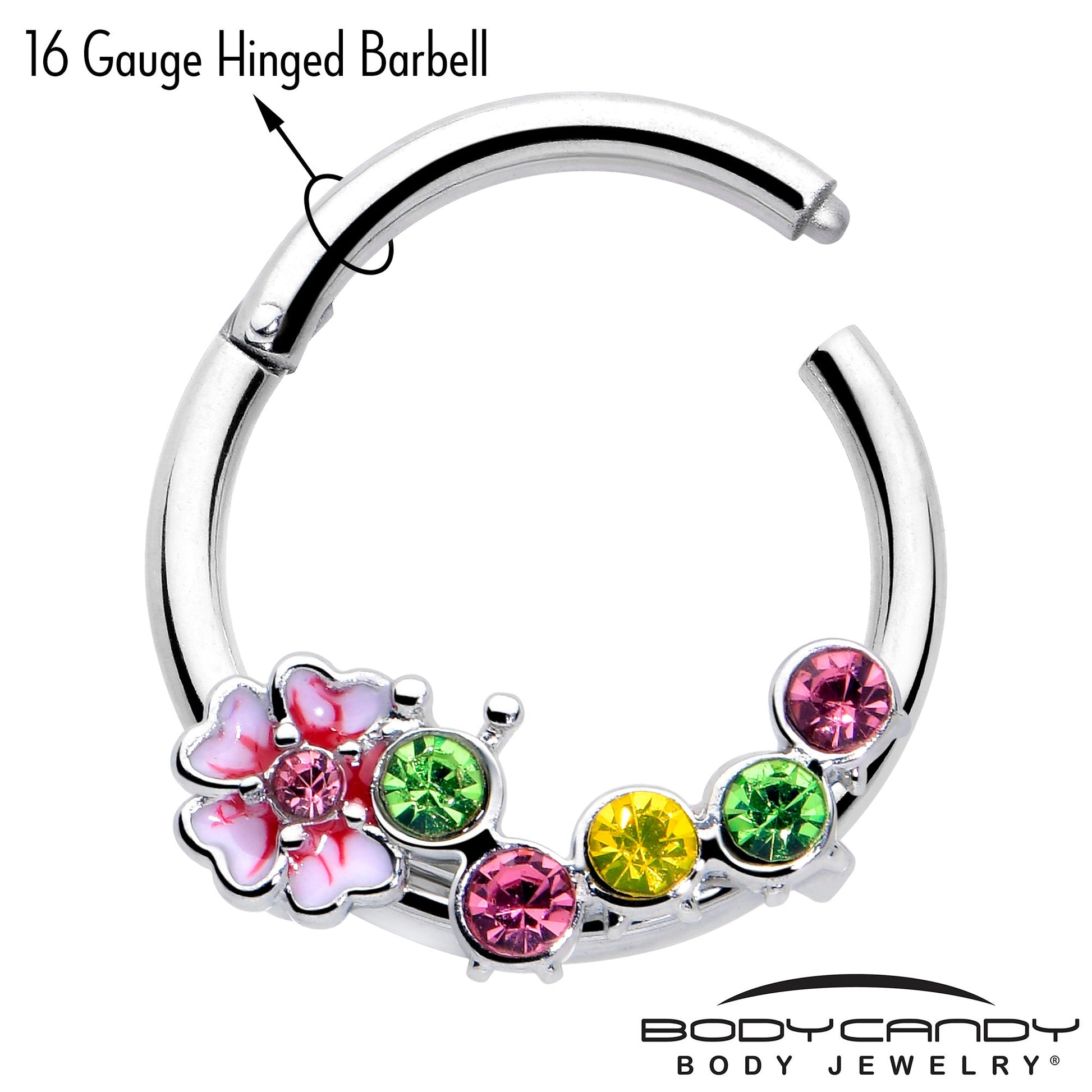 Get hungry for floral fabulousness with the caterpillar on this 16 gauge septum ring. It is made with a 10mm durable 316L surgical grade stainless steel hinged circular ring. It features a flower charm, inlaid in shades of pink and set with a pink cubic zirconia gem at the center. At one side of the flower is a caterpillar, composed entirely of green, pink, and yellow cubic zirconia gems. It also features a non-removable, hinged segment that makes insertion and removal a breeze and you can even rock it in multiple piercings including tragus, helix, and some daith piercings. Conjure a whimsical new style with this insect and floral cartilage piercing jewelry.Specifications