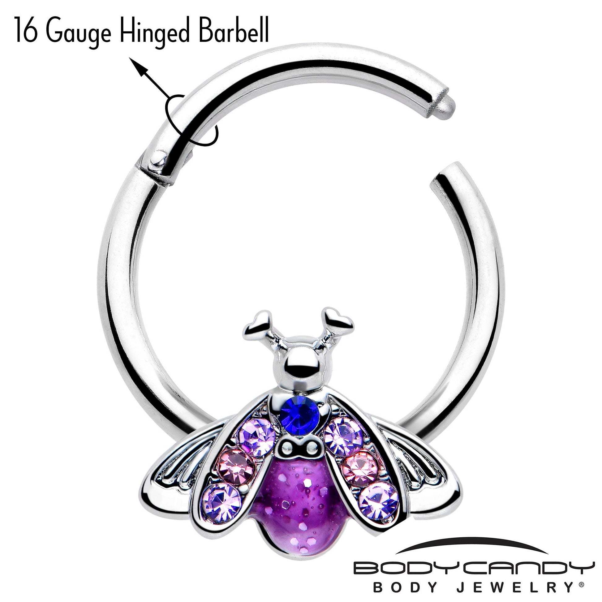 Show some love for the planet's tiny critters with this 16 gauge septum ring. It's made with a 10mm durable 316L surgical grade stainless steel hinged circular ring. It features an insect charm, lavishly paved with pink, purple, and blue gems and featuring a glitter inlaid purple body. It also features a non-removable, hinged segment that makes insertion and removal a breeze and you can even rock it in multiple piercings including tragus, helix, and some daith piercings. Don't let boring body jewelry bug you when you can rock this extravagant, insect cartilage piercing jewelry.Specifications