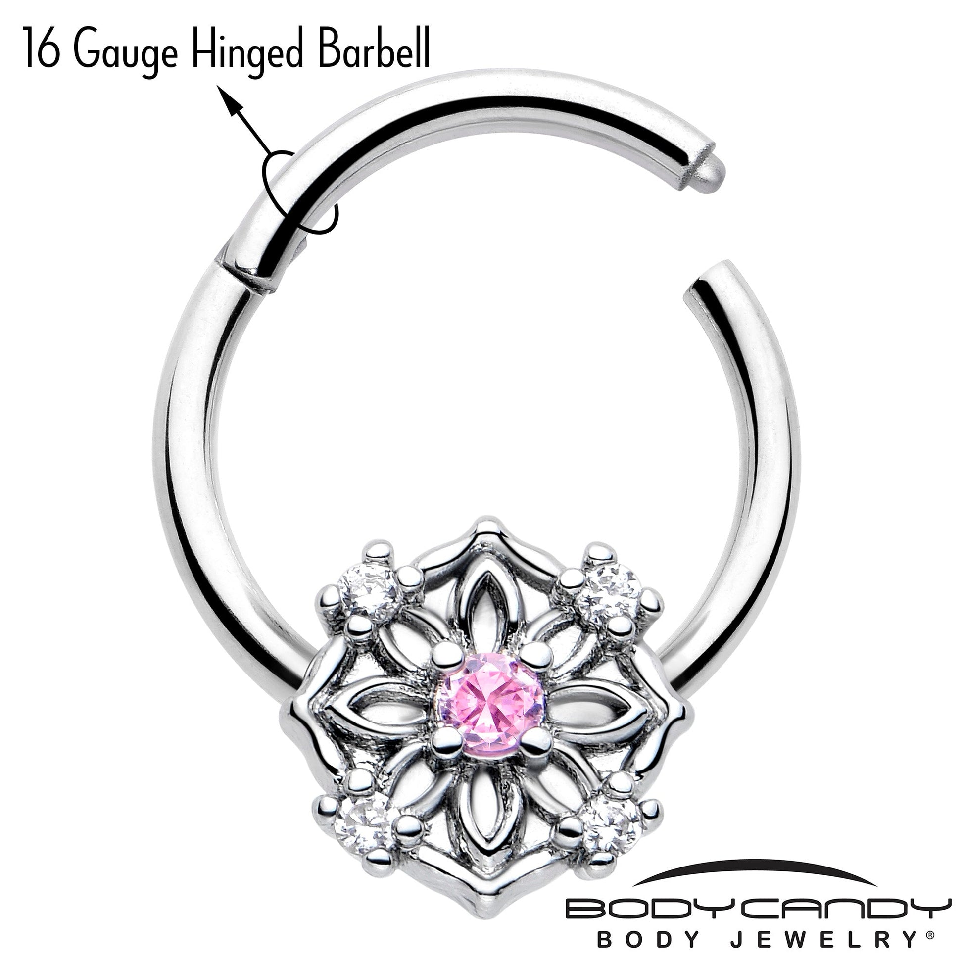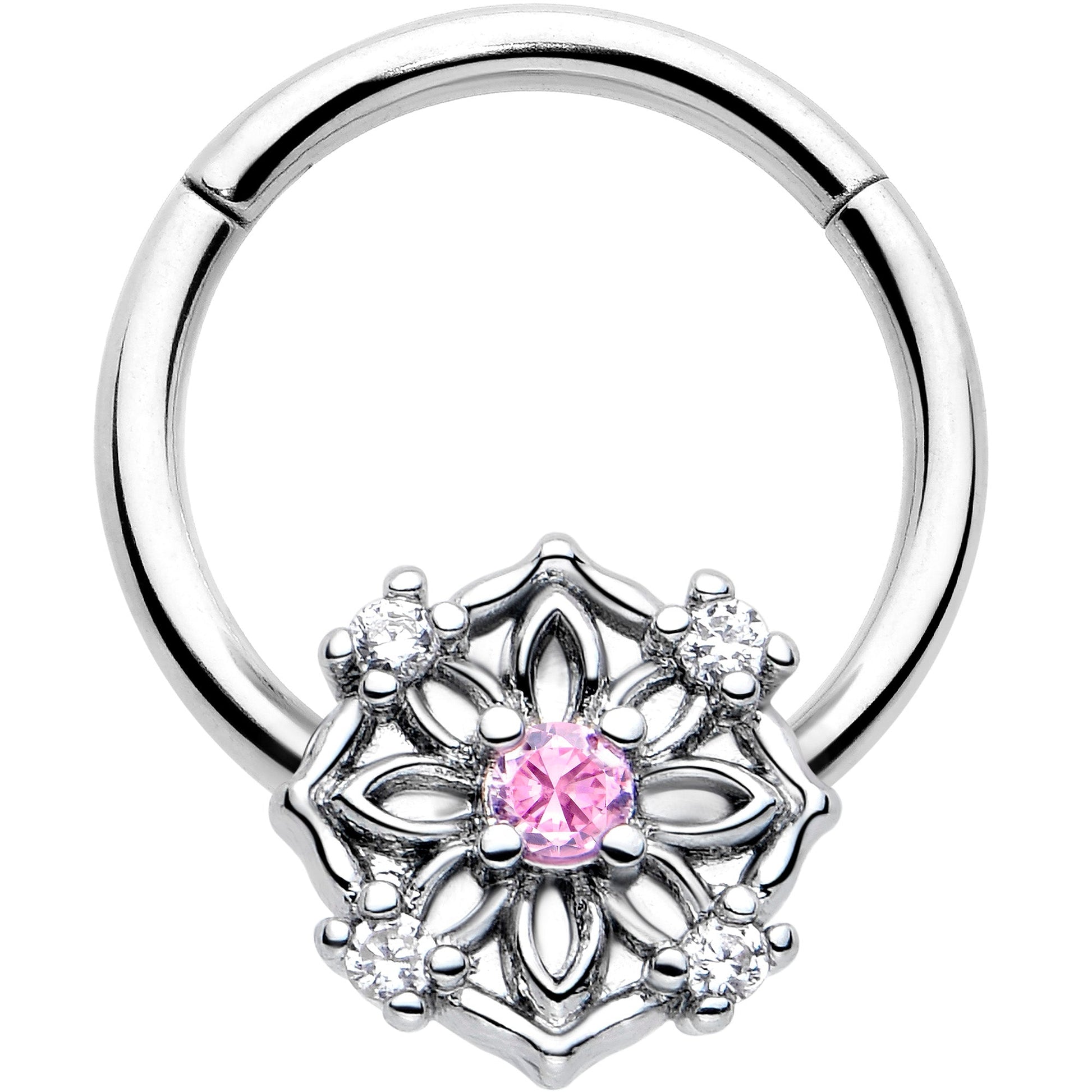 Your style will be blooming with this 16 gauge septum ring. It's made with a 10mm durable 316L surgical grade stainless steel hinged circular ring. It features a circular flower charm with openwork petals. The flower is set with a pink cubic zirconia gem center and clear cubic zirconia gems along the outer edges. It also features a non-removable, hinged segment that makes insertion and removal a breeze and you can even rock it in multiple piercings including tragus, helix, and some daith piercings, Let your look blossom with this fabulous floral cartilage piercing jewelry.Specifications