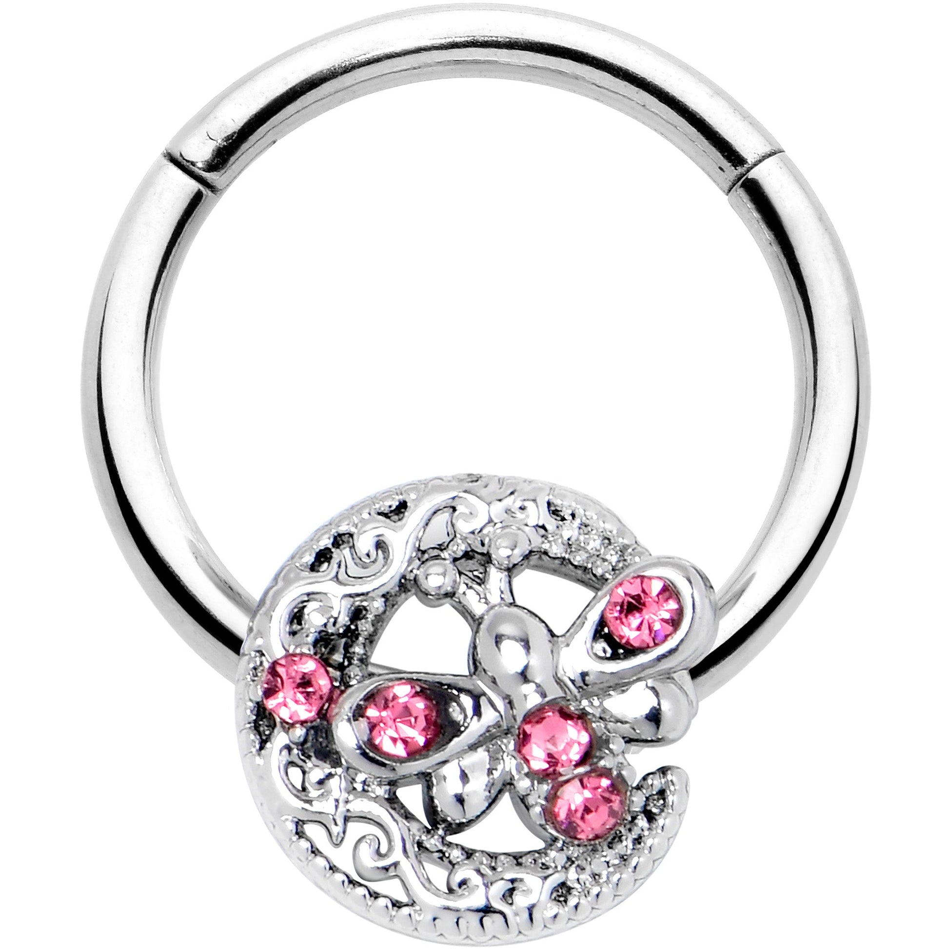 This crescent moon may be alone in the sky but it's got a friend on this 16 gauge septum ring. It is made with a 10mm durable 316L surgical grade stainless steel hinged circular ring. It features a crescent moon charm, embellished with filigree detailing giving it an airy appearance as well as a pink gem embellishment. Set between the points of the moon is a dragonfly charm, with pink gems in the wings and body. It also features a non-removable, hinged segment that makes insertion and removal a breeze and you can rock it in multiple piercings including tragus, helix, and some daith piercings. You'll want this cartilage piercing jewelry to keep you company forever.Specifications