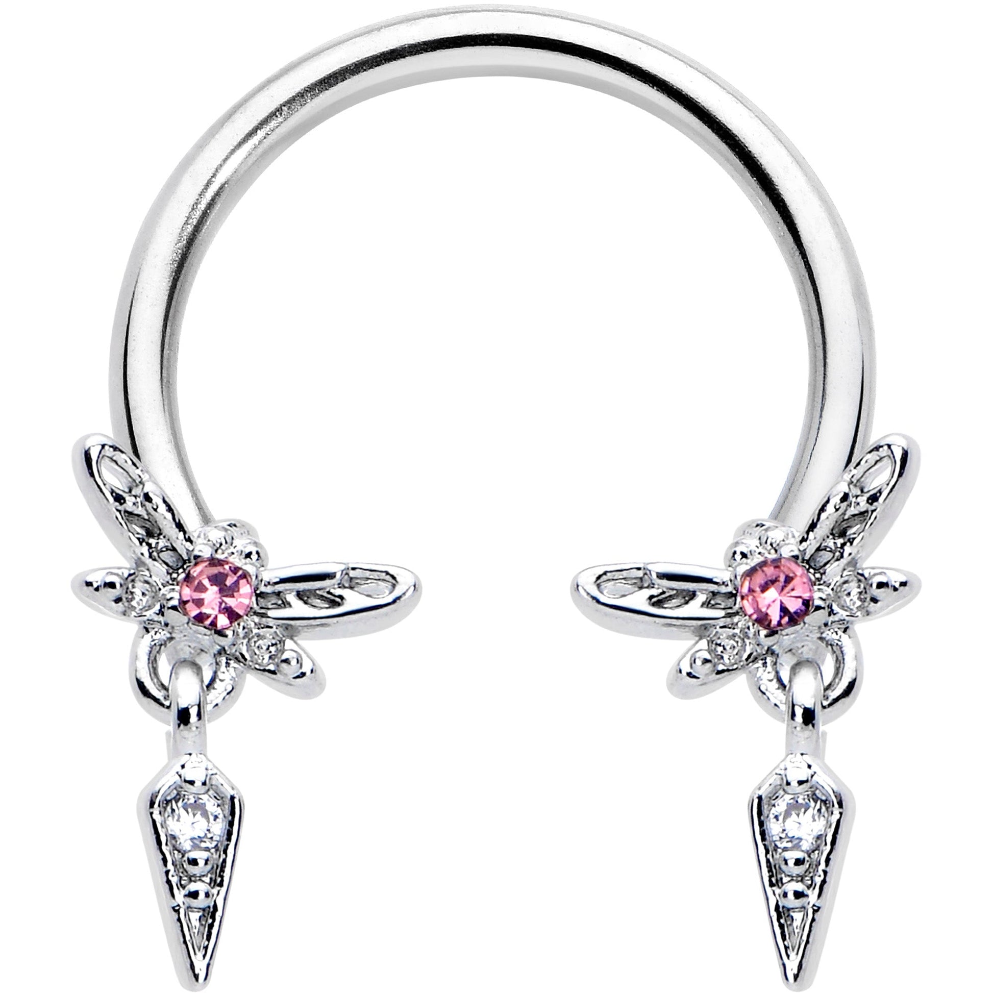 The delightful dragonfly on this 16 gauge septum ring is so lovely it is almost magical. It is made with a 10mm durable 316L surgical grade stainless steel circular barbell. It features a pair of dragonfly charm ends, each set with pink gem bodies and matching clear gems on the lower wings and heads for lovely touches of color. They also feature triangular dangle tails set with clear gems for added motion and style. You can even rock them in multiple piercings including tragus, helix, and some conch piercings. Give your look a touch of nature with this delicious dragonfly cartilage piercing jewelry.Specifications
