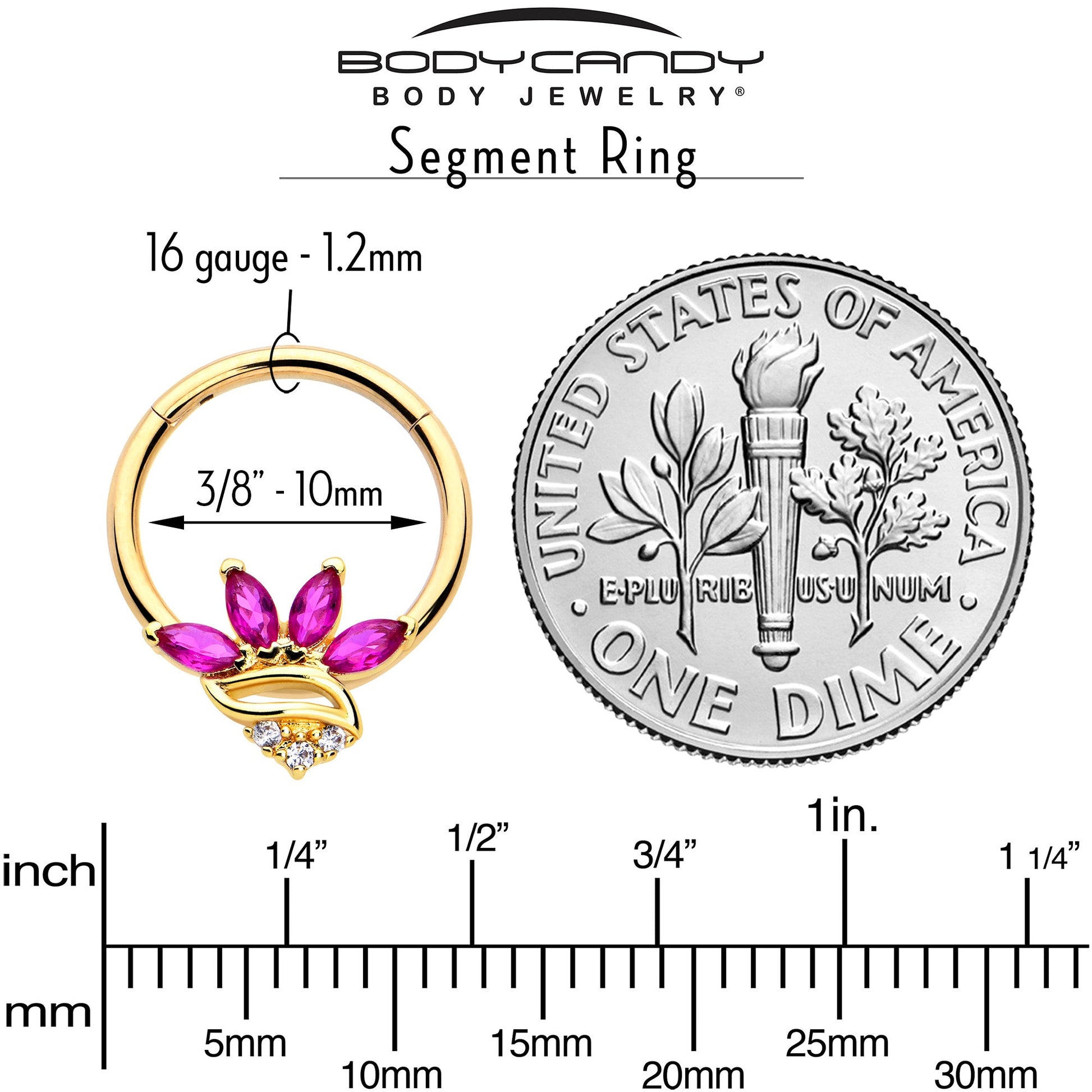 You're sure to be a fan of this 16 gauge septum ring. It's made with a 10mm gold tone PVD over 316L surgical grade stainless steel hinged circular ring. It features a red cubic zirconia gem charm, fanned out and set above a swirl embellishment. At the base are clear cubic zirconia gems for an added touch of style. It also features a non-removable, hinged segment that makes insertion and removal a breeze and you can even rock it in multiple piercings including tragus, helix, and some daith piercings. This cartilage piercing jewelry has so much glamour it'll make your head swirl.Specifications