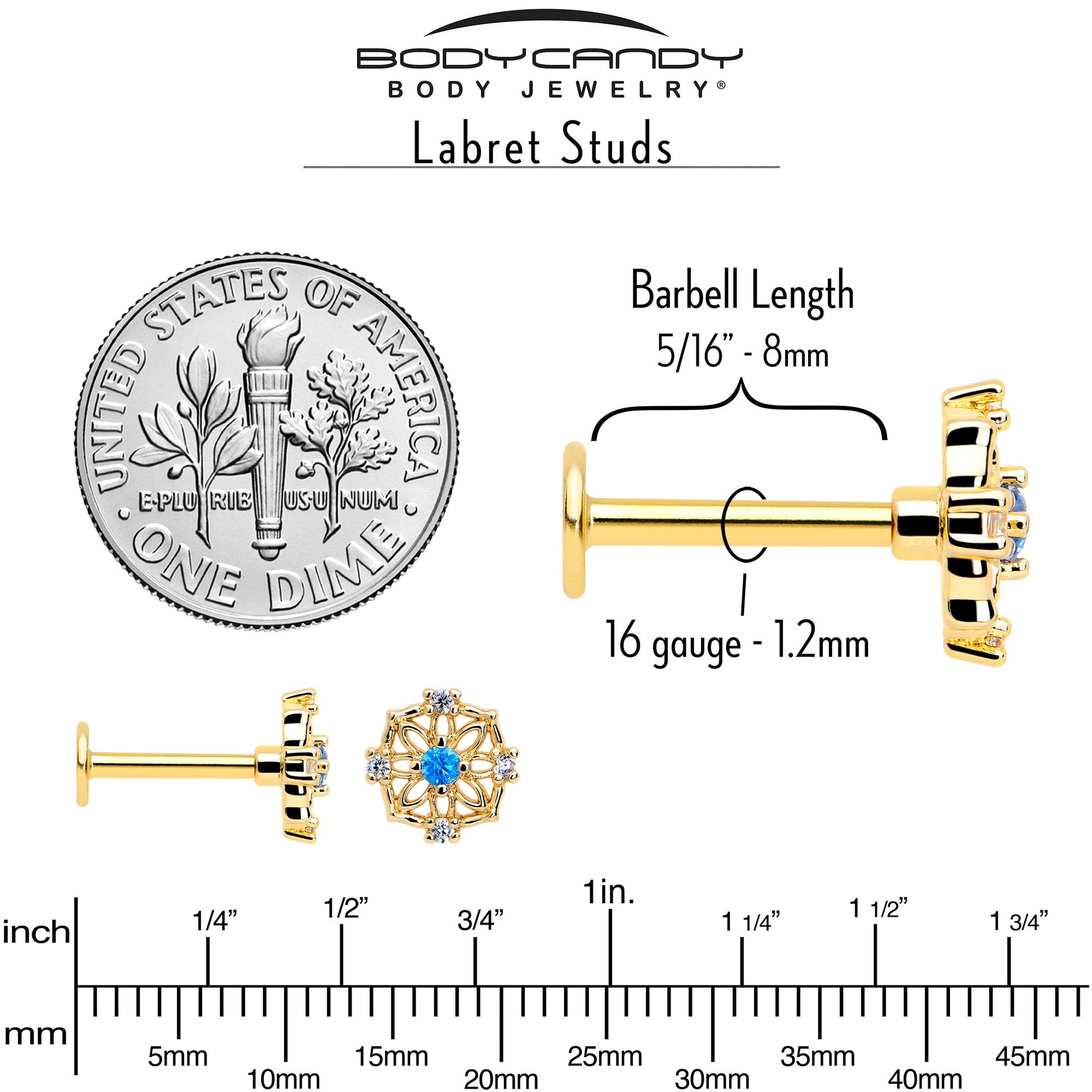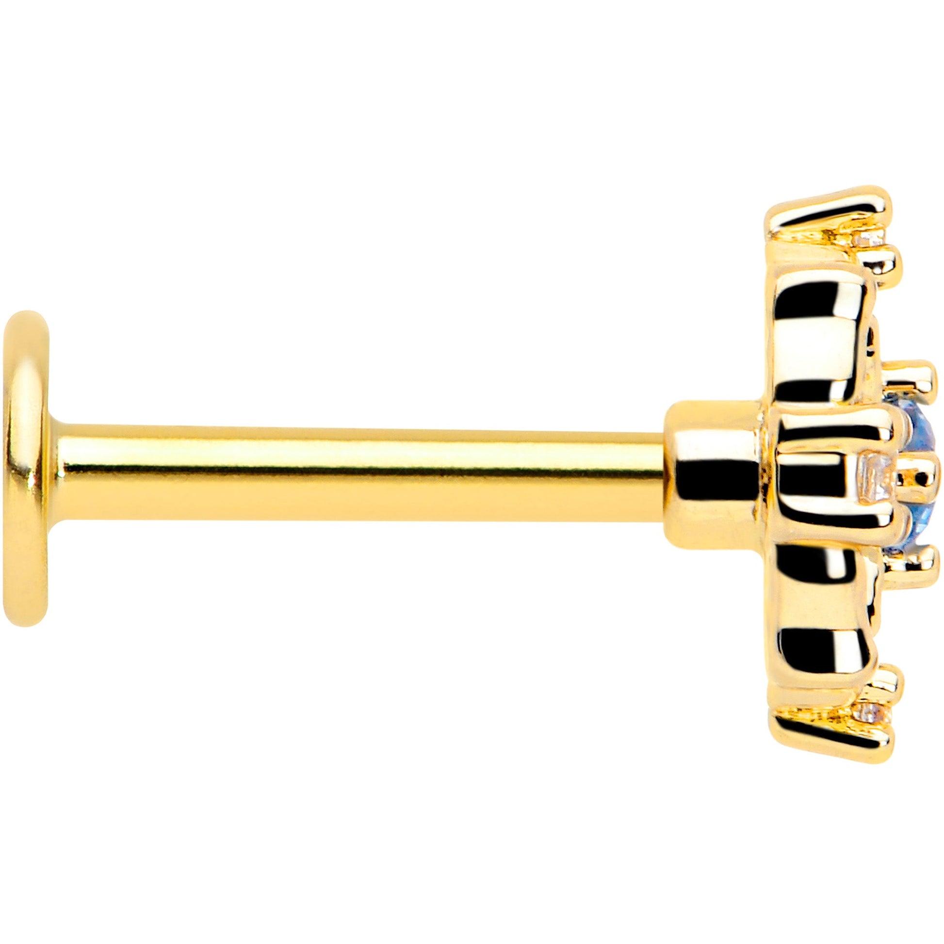 Your style will be blooming with this 16 gauge lip ring. It's made with an 8mm gold tone PVD over 316L surgical grade stainless steel straight post with a flat disc end. It features a circular flower charm with openwork petals. The flower is set with a blue cubic zirconia gem center and clear cubic zirconia gems along the outer edges. You can even rock it in multiple piercings including lip, monroe, tragus, helix, and some conch piercings, Let your look blossom with this fabulous floral cartilage piercing jewelry.Specifications