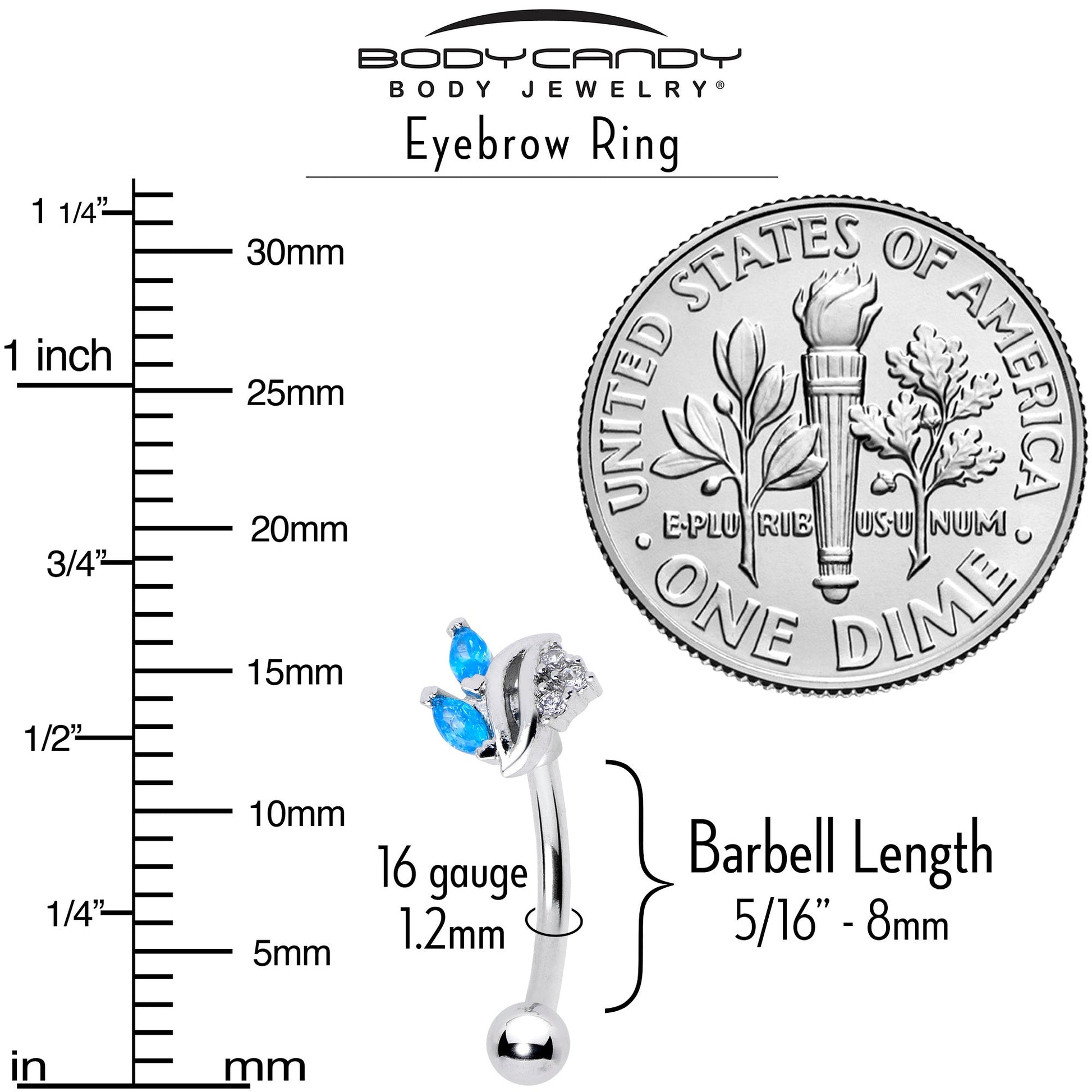You're sure to be a fan of this 16 gauge eyebrow jewelry. It's made with an 8mm durable 316L surgical grade stainless steel curved barbell with a 3mm bottom ball end. The top features a pair of blue cubic zirconia gems fanned out and set above a swirl embellishment. At the base are clear cubic zirconia gems for an added touch of style. You can even rock it in multiple piercings including eyebrow and rook piercings. This cartilage piercing jewelry has so much glamour it'll make your head swirl.Specifications