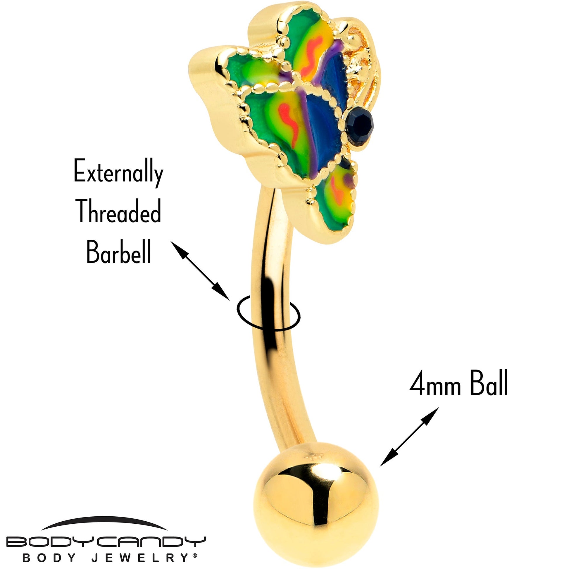 Have a look that's live and in color with this 16 gauge eyebrow jewelry. It's made with an 8mm gold tone PVD over 316L surgical grade stainless steel curved barbell with a 3mm bottom ball end. The top features a butterfly charm, with intense blue, yellow, and green colors and embellished with a deep blue gem eye for an added touch of style that you can rock in multiple piercings including eyebrow and rook piercings. Rock some rich colors that can't be ignored when you're rocking this colorful butterfly cartilage piercing jewelry.Specifications