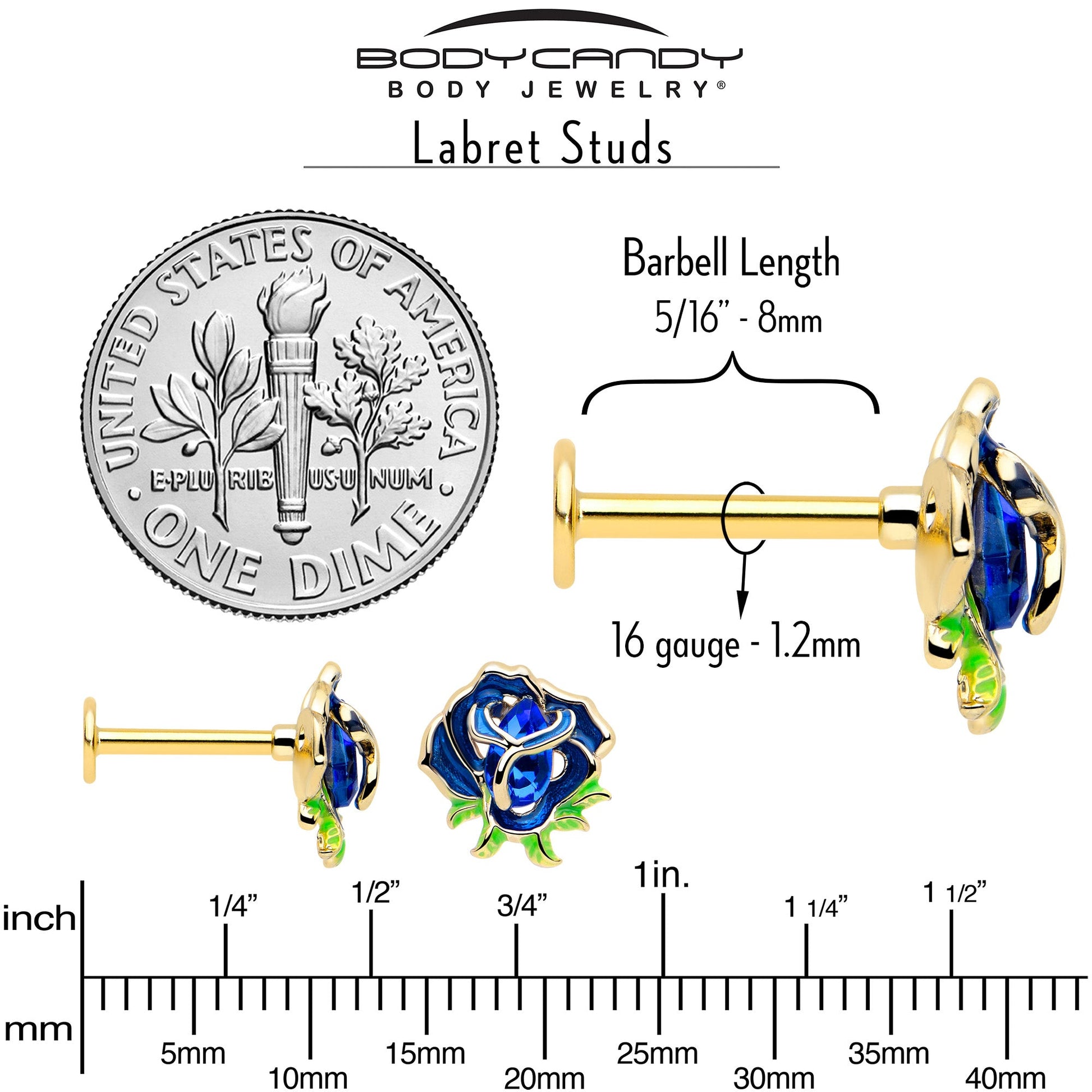 Dive into the depths of style with this 16 gauge lip ring. It's made with an 8mm gold tone PVD over 316L surgical grade stainless steel straight post with a flat disc end. It features a flower charm, inlaid in the deepest of blues. It is further embellished with a matching deep blue gem center and green leafy detailing at the bottom and you can rock it in multiple piercings including lip, monroe, tragus, helix, and some conch piercings. Get the blues in the best way possible with this fabulous, floral flower cartilage piercing jewelry.Specifications