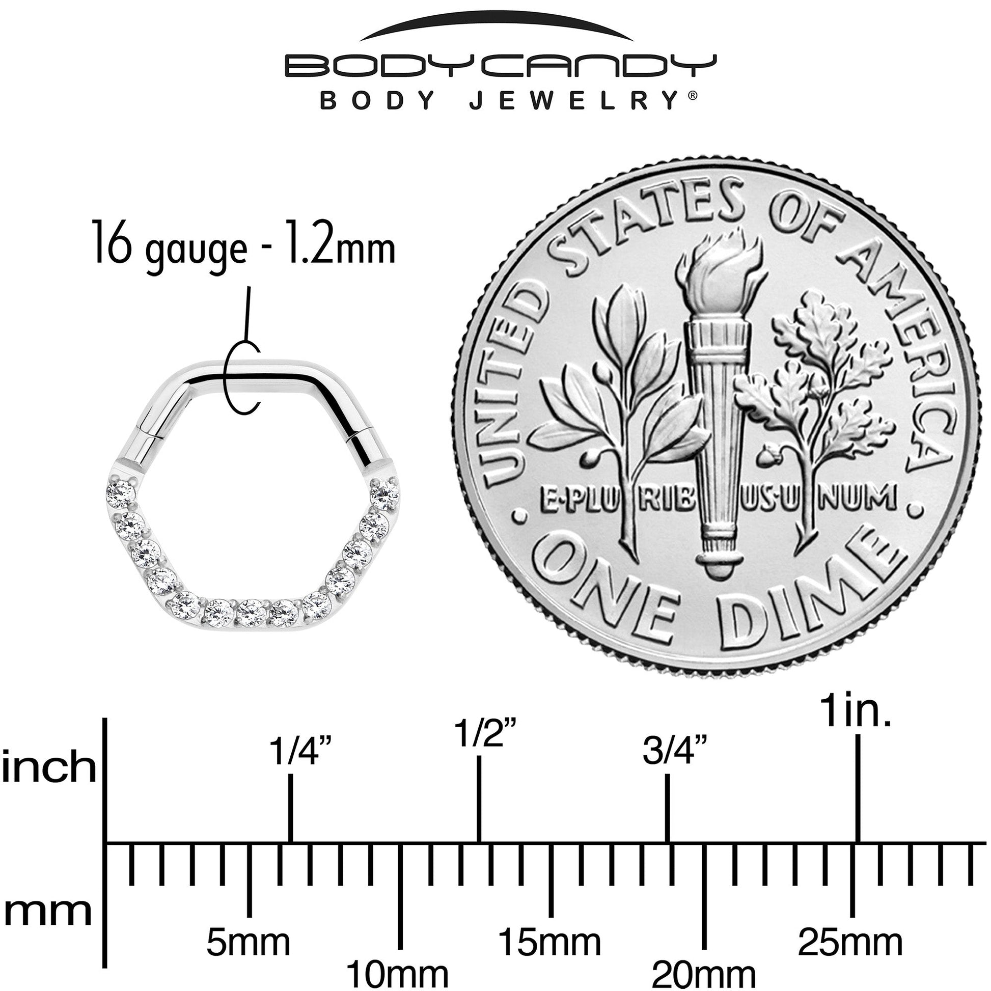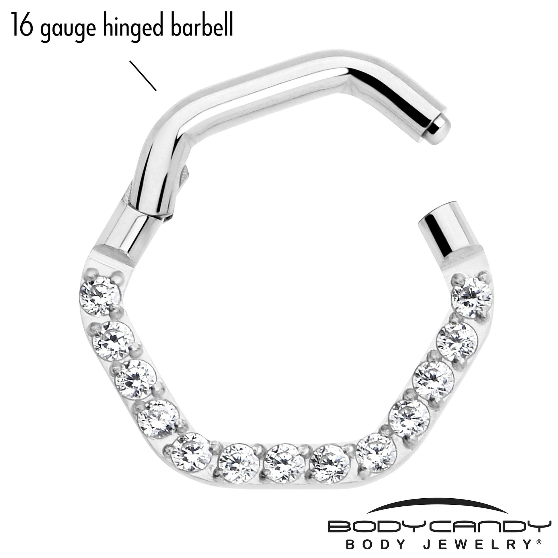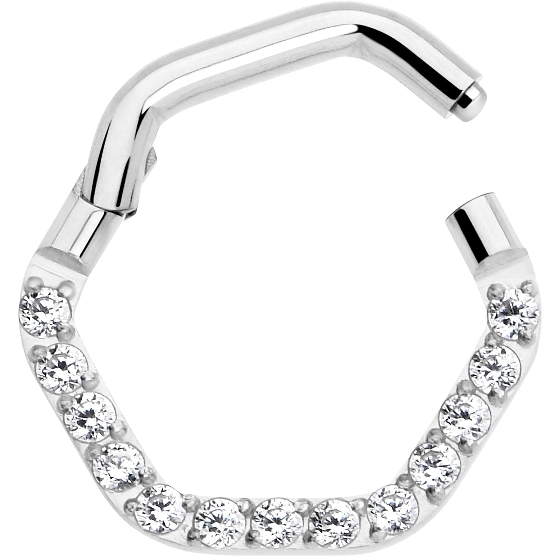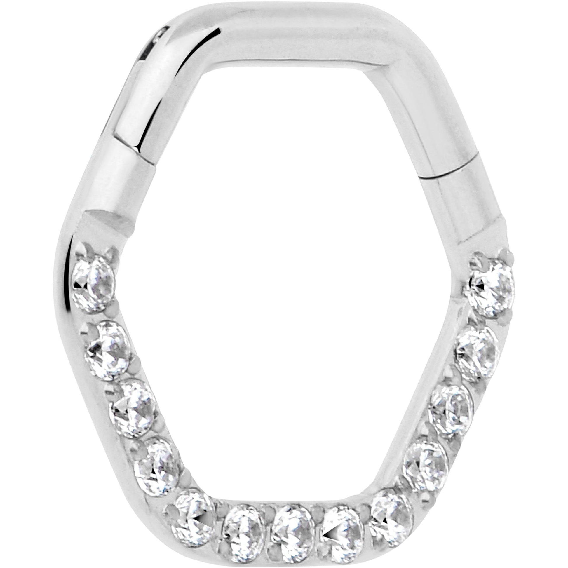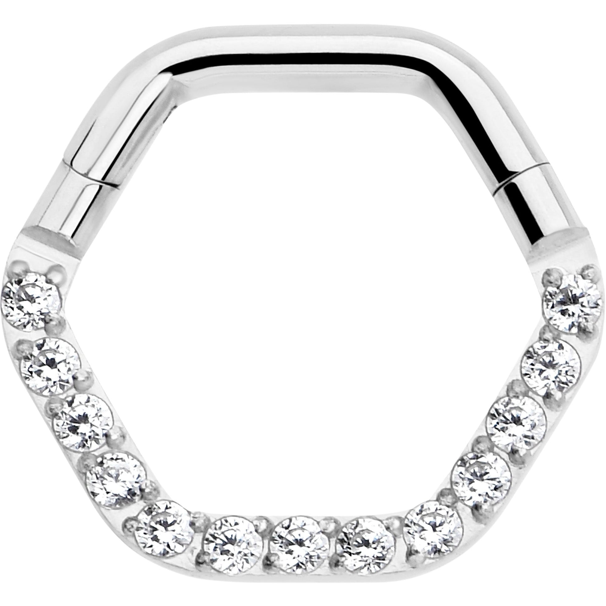 Add a touch of sophistication to your look with this 16 gauge septum ring. It's made with an 8mm durable 316L surgical grade stainless steel hinged ring with a hexagon shape. The bottom arc of this cartilage earring is paved with clear cubic zirconia gems for a look that's totally attention-getting without being over-the-top. It also features a hinged, non-removable segment that makes insertion and removal a breeze and you can rock it in multiple piercings including tragus, helix, and some conch piercings. So why be subtle when you can be ultra-glam with this fabulously extravagant cartilage piercing jewelry.Specifications