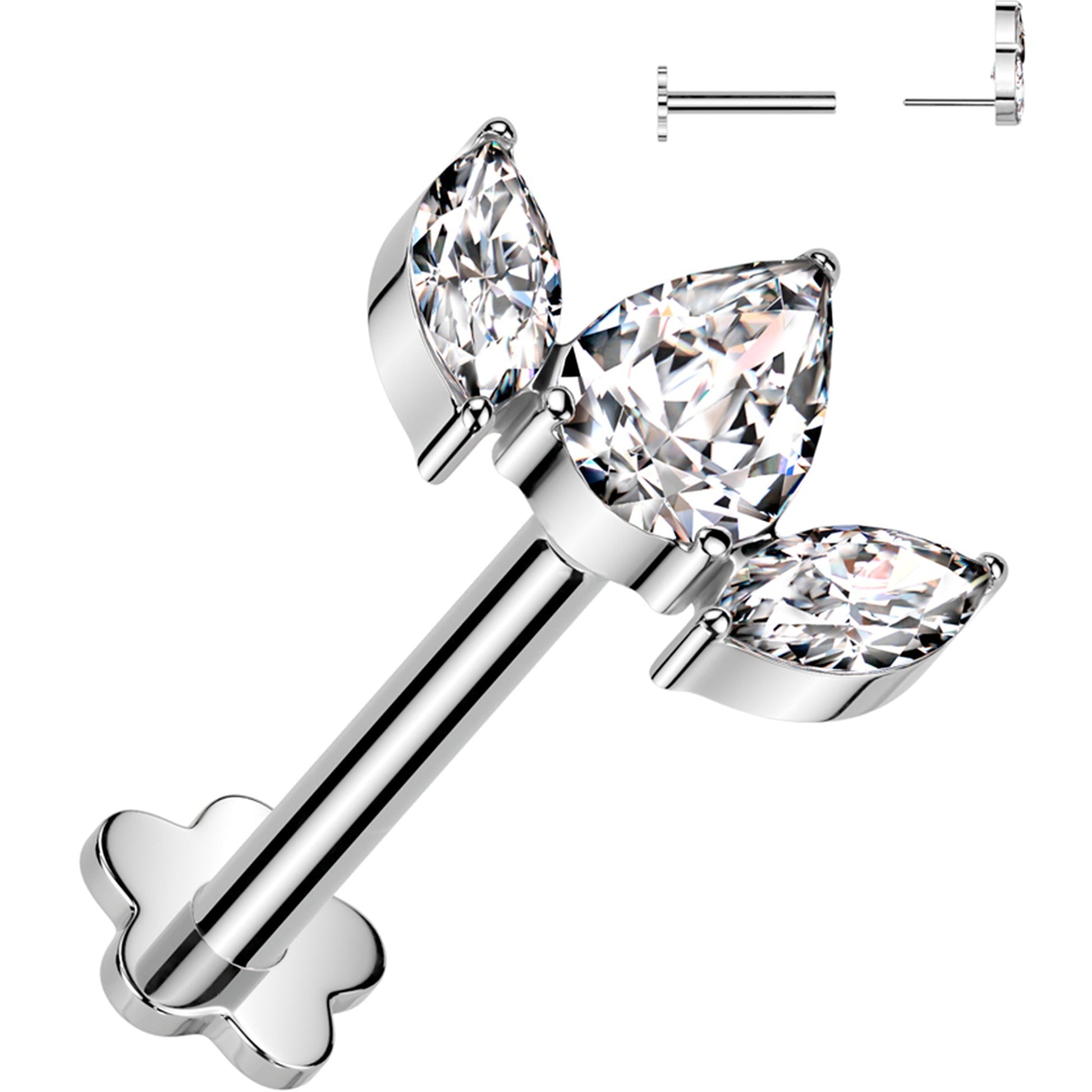 Get triple the style with this 16 gauge lip ring. It's made with an 8mm ASTM F-136 implant grade titanium straight post. The front end features a trio of oval clear cubic zirconia gems in a fan shape and featuring a threadless design that makes insertion and removal a snap. The back end features a flower shape, for a charming change from the standard disc shape and you can wear it reversed for twice the style. You can even rock this jewelry in multiple piercings including lip, monroe, tragus, helix, and some conch piercings. With such an endearing style and such thoughtful details, this flat back earring is one you'll love three times as much.Specifications