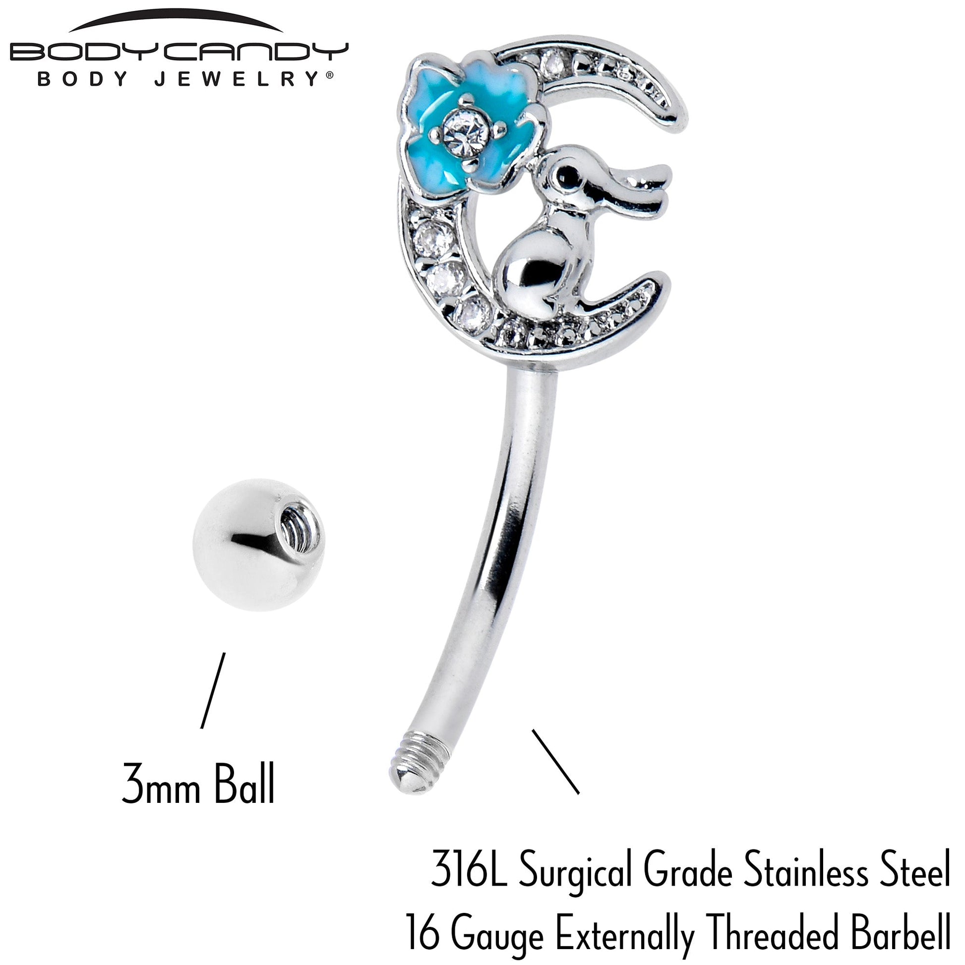 The little bunny on this 16 gauge eyebrow jewelry has gone exploring new realms. It's made with an 8mm durable 316L surgical grade stainless steel curved barbell with a 3mm bottom ball end. The top end features a crescent moon charm, paved with clear cubic zirconia gems. Sitting on the moon is a rabbit, with simple detailing and a black eye embellishment. The moon is further embellished with a blue flower and you can even rock it in multiple piercings including eyebrow and rook. Fall down a rabbit hole of style with this celestial bunny cartilage piercing ring.Specifications