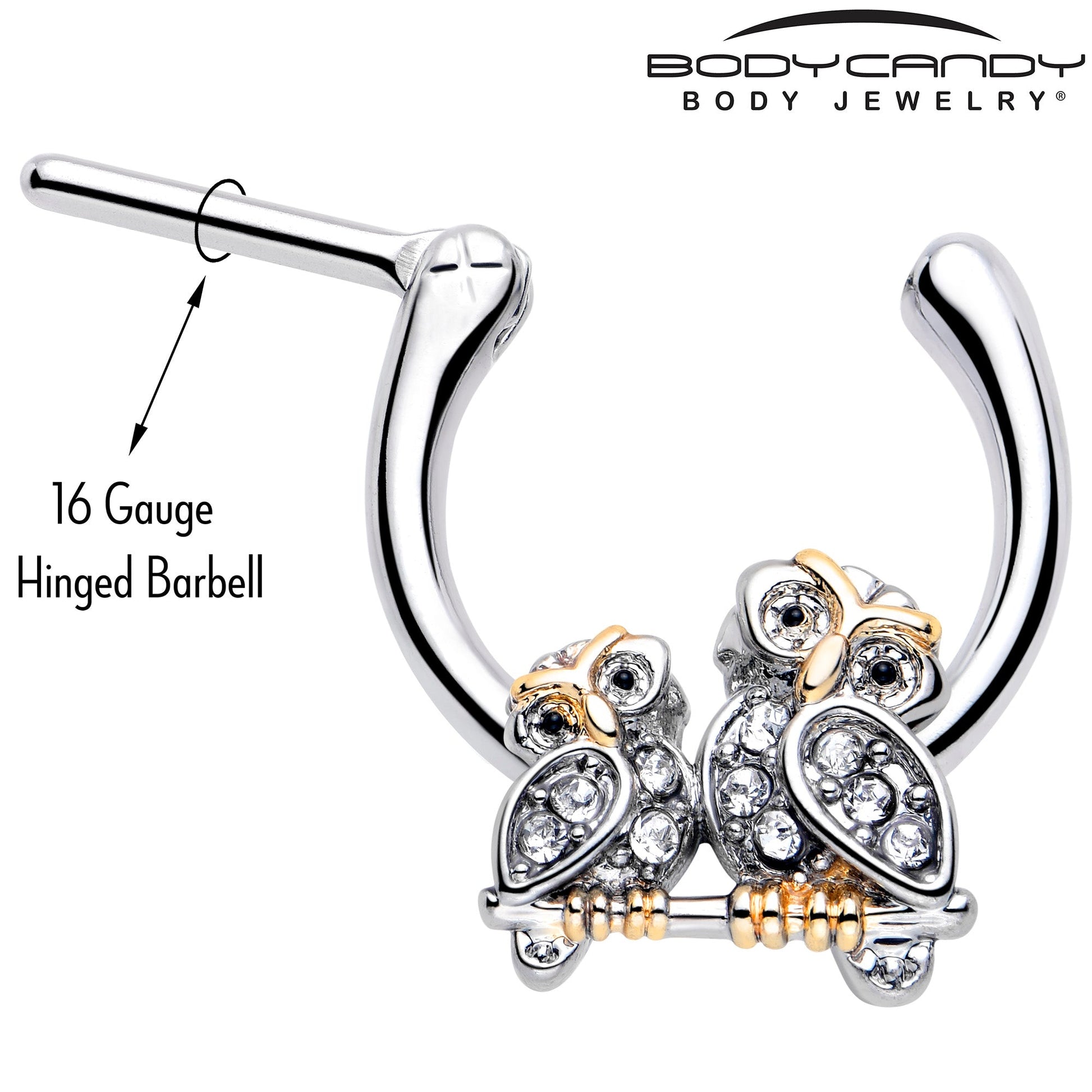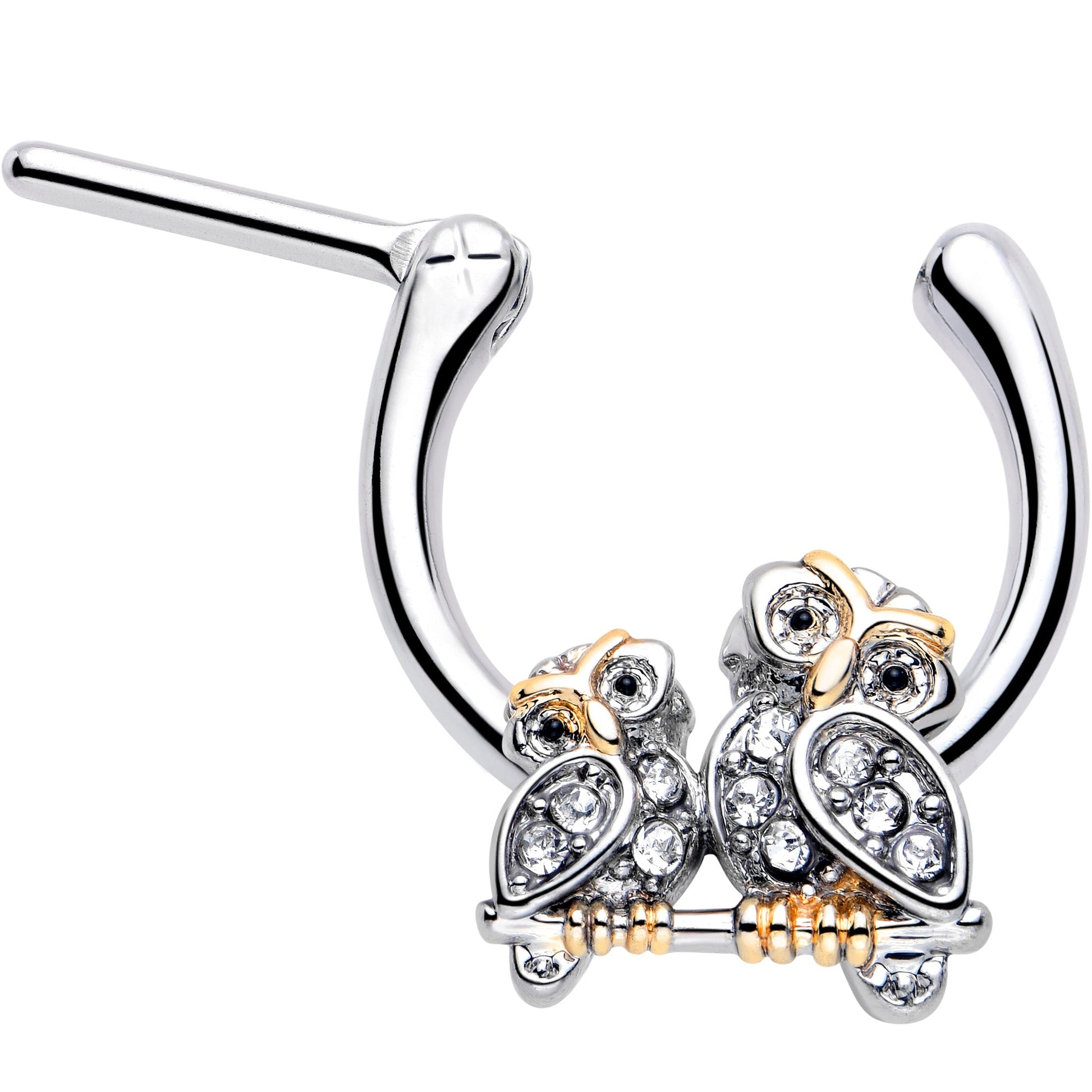 If only all the owls looked as elegant as the ones on this 16 gauge septum ring. It's made with an 8mm durable 316L surgical grade stainless steel hinged straight barbell. It features a pair of owls charm with clear gems. They also feature gold tone embellishment for a truly striking combination of forest and fancy that's sure to attract attention. It features a hinged, clicker design that makes insertion and removal a snap and you can rock it in multiple piercings including tragus, helix, and some conch piercings. When you're rocking this elegant evening owls cartilage piercing jewelry you're sure to look like avian aristocracy.Specifications