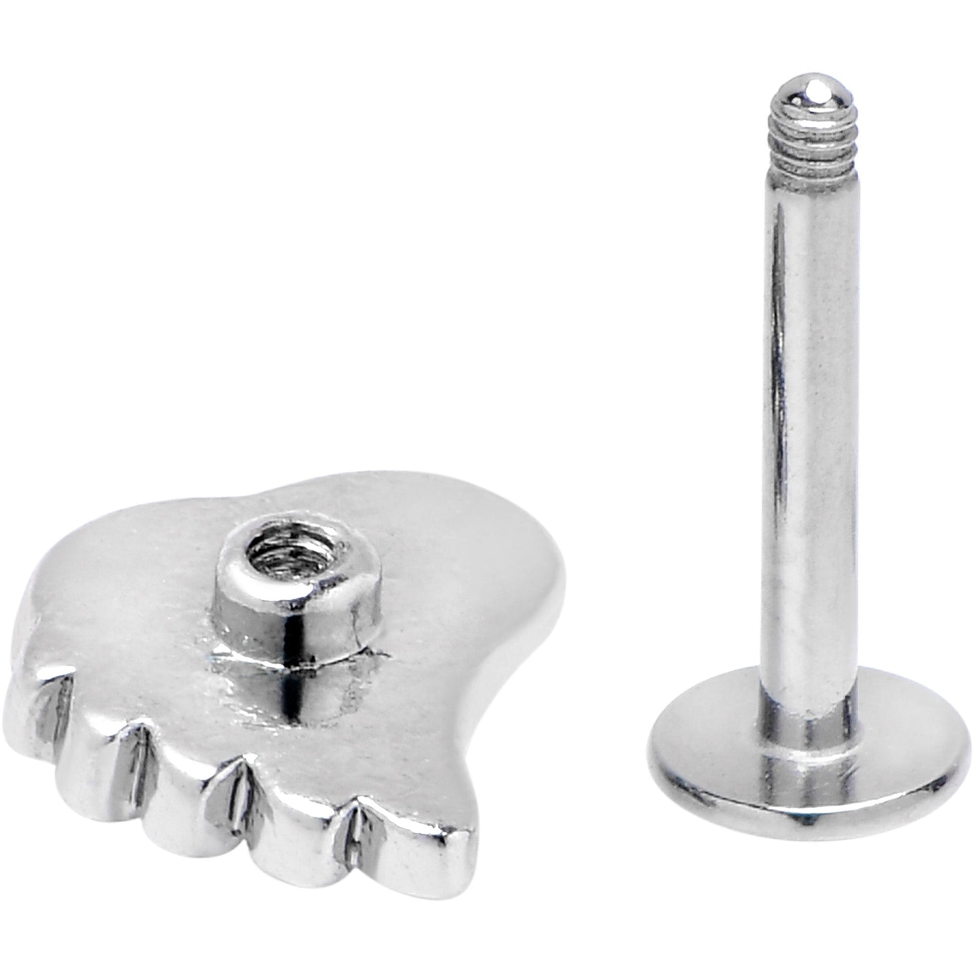 Give yourself a heavenly new look with this 16 gauge lip ring. It's made with an 8mm durable 316L surgical grade stainless steel straight post with a flat disc end. It features a heart shaped charm featuring an angel's wings, with one side paved with clear gems. The other side features white inlay and simply styled feather details and you can rock it in multiple piercings including lip, monroe, tragus, helix, and some conch piercings. Let your look and your spirit soar with this stylish and spiritual cartilage piercing jewelry.Specifications