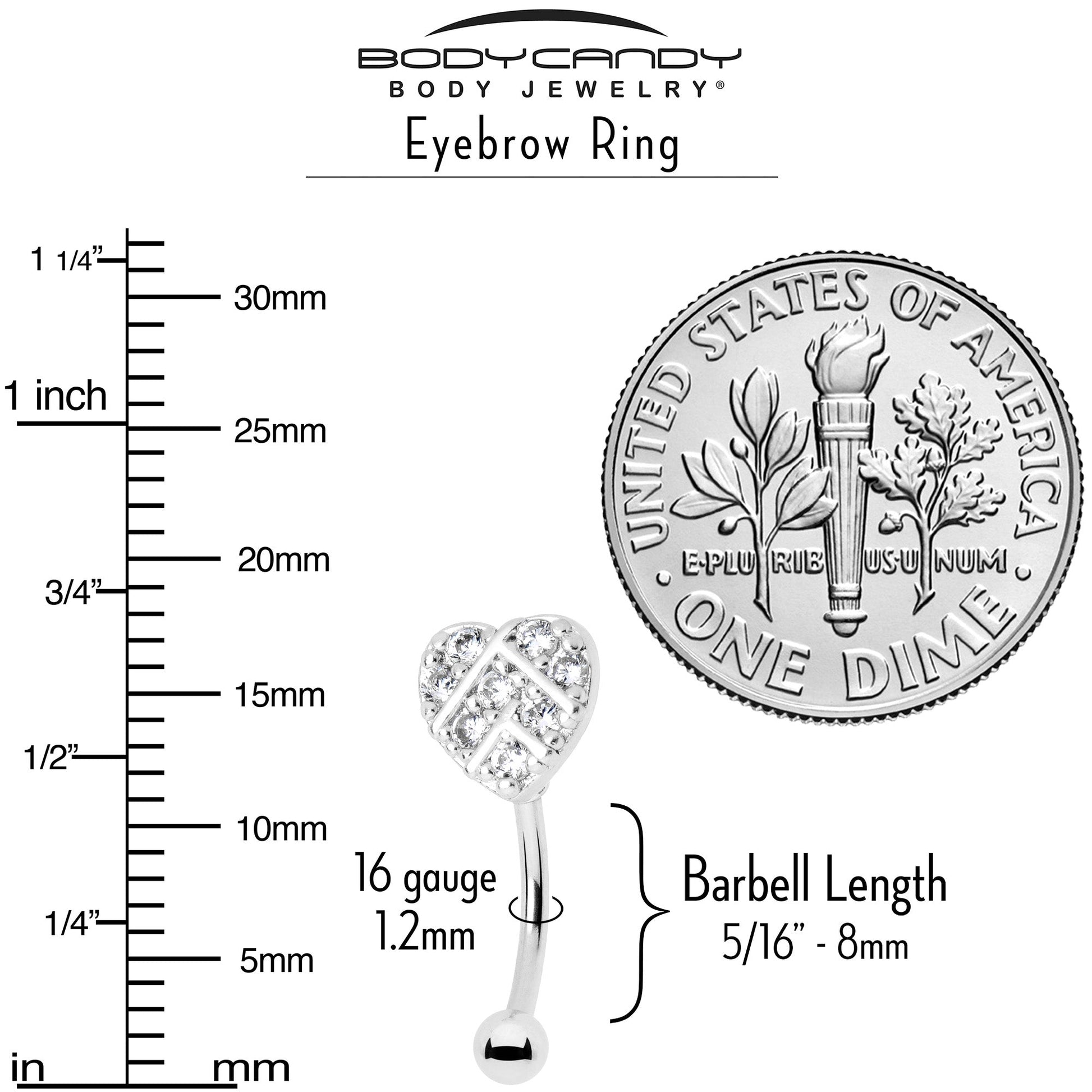 Get a luxe look of love with lattice this Valentine's Day with this 16 gauge eyebrow jewelry. It's made with an 8mm durable 316L surgical grade stainless steel curved barbell with a 3mm bottom ball end. The top end features a heart charm, with latticework detailing. Set in between each of the lines are clear gems for an added touch of style that really takes this look over the top. You can even rock it in multiple piercings including eyebrow, rook, and some daith piercings. Fall in love with style when you're rocking this heart themed cartilage piercing jewelry.Specifications