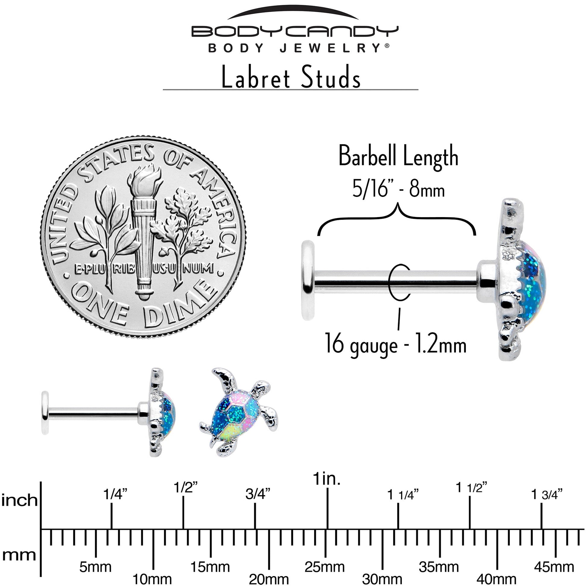 The turtle on this 16 gauge lip ring is all decked out in glitzy style. It's made with an 8mm durable 316L surgical grade stainless steel straight post with a flat disc end. It features a turtle charm, with a glitter inlaid shell in blue, pink, and yellow, as well as detailed features for added realism. You can even rock it in multiple piercings including lip, monroe, tragus, helix, and some conch piercings. You will be swimming in compliments when you're rocking this colorful turtle cartilage piercing jewelry.Specifications