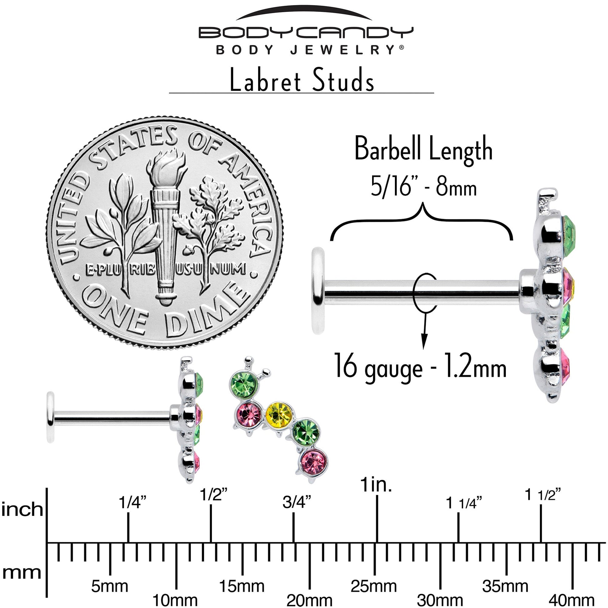 Get hungry for floral fabulousness with the caterpillar on this 16 gauge lip ring. It is made with an 8mm durable 316L surgical grade stainless steel straight post with a flat disc end. It features a caterpillar charm, composed entirely of green, pink, and yellow gems. It is further embellished with tiny antennae detailing and you can even rock it in multiple piercings including lip, monroe, tragus, helix, and some conch piercings. Conjure a whimsical new style with this insect cartilage piercing jewelry.Specifications