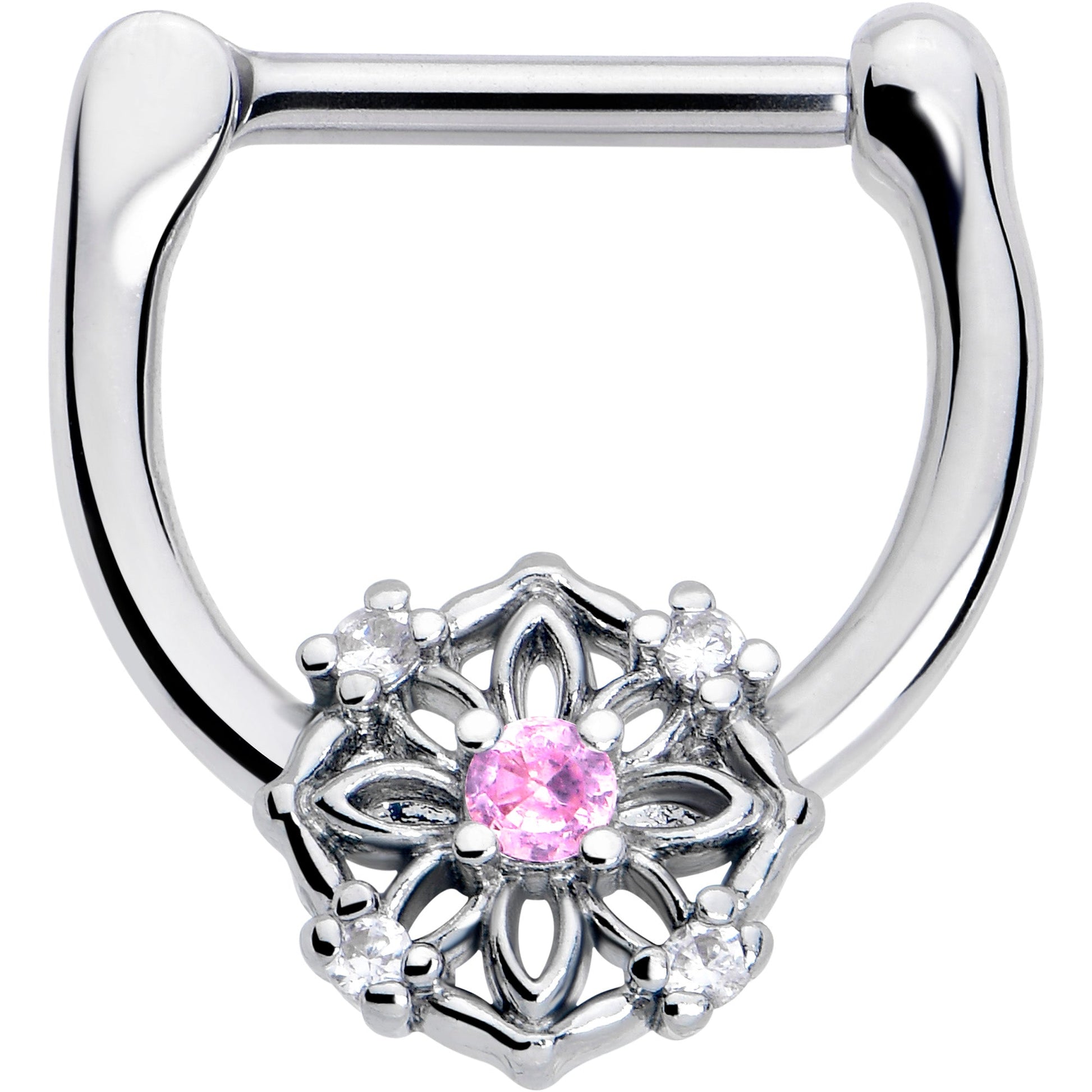Your style will be blooming with this 16 gauge septum ring. It's made with an 8mm durable 316L surgical grade stainless steel hinged straight barbell. It features a circular flower charm with openwork petals. The flower is set with a pink cubic zirconia gem center and clear cubic zirconia gems along the outer edges. It also features a hinged, clicker design that makes insertion and removal a snap and you can even rock it in multiple piercings including tragus, helix, and some conch piercings, Let your look blossom with this fabulous floral cartilage piercing jewelry.Specifications