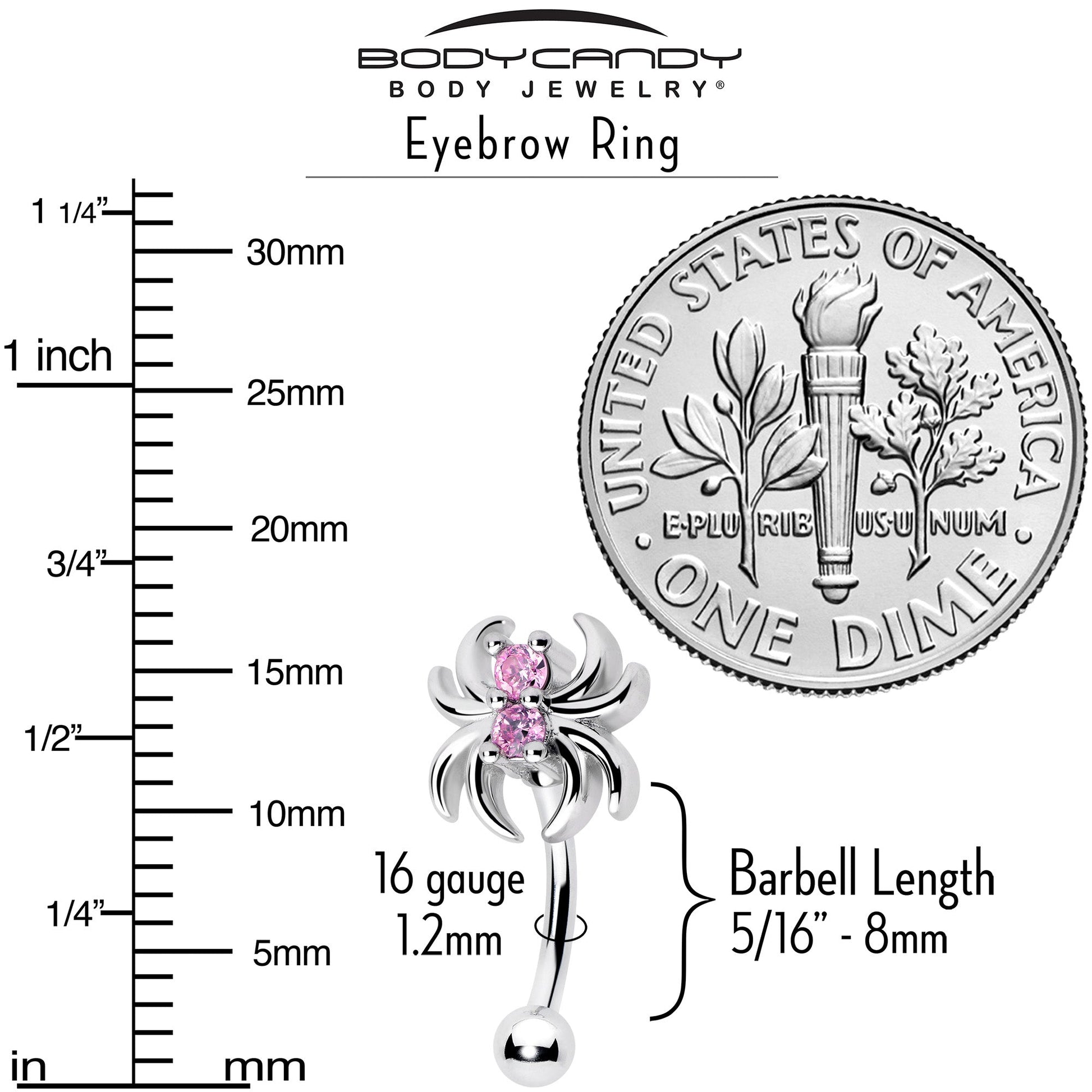 This 16 gauge spider eyebrow jewelry will give you the shivers.....but not shivers of fear. It's made with an 8mm durable 316L surgical grade stainless steel curved barbell with a 3mm bottom ball end. The top end features a spider charm with the body and the head composed of pink cubic zirconia gems. It also features elegantly delineated legs and you can even rock it in multiple piercings including eyebrow and some rook piercings. So whether you cherish creepy crawlies or appreciate arachnids, this cartilage piercing jewelry is sure to snare you in its web.Specifications
