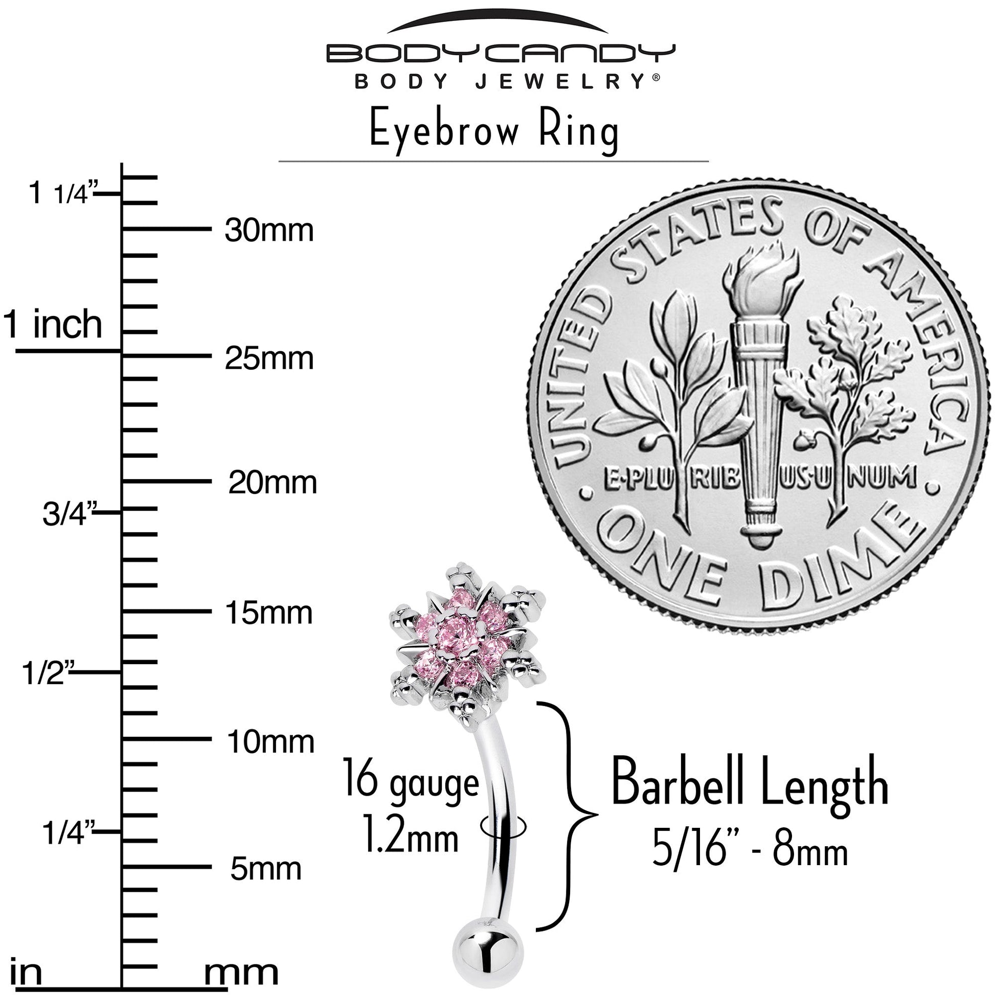 16G 5/16 Pink CZ Gem Snowflake Glam Curved Eyebrow Ring