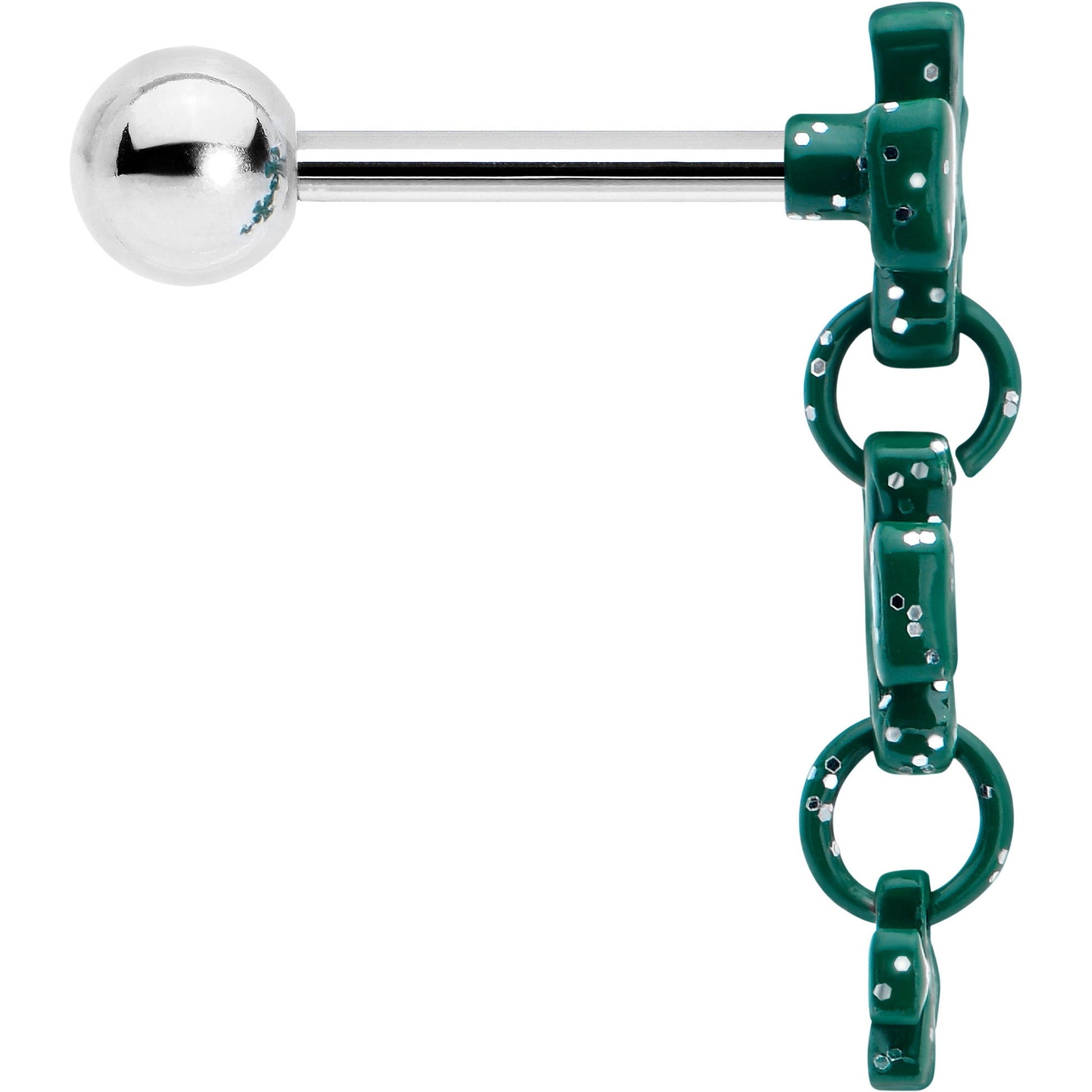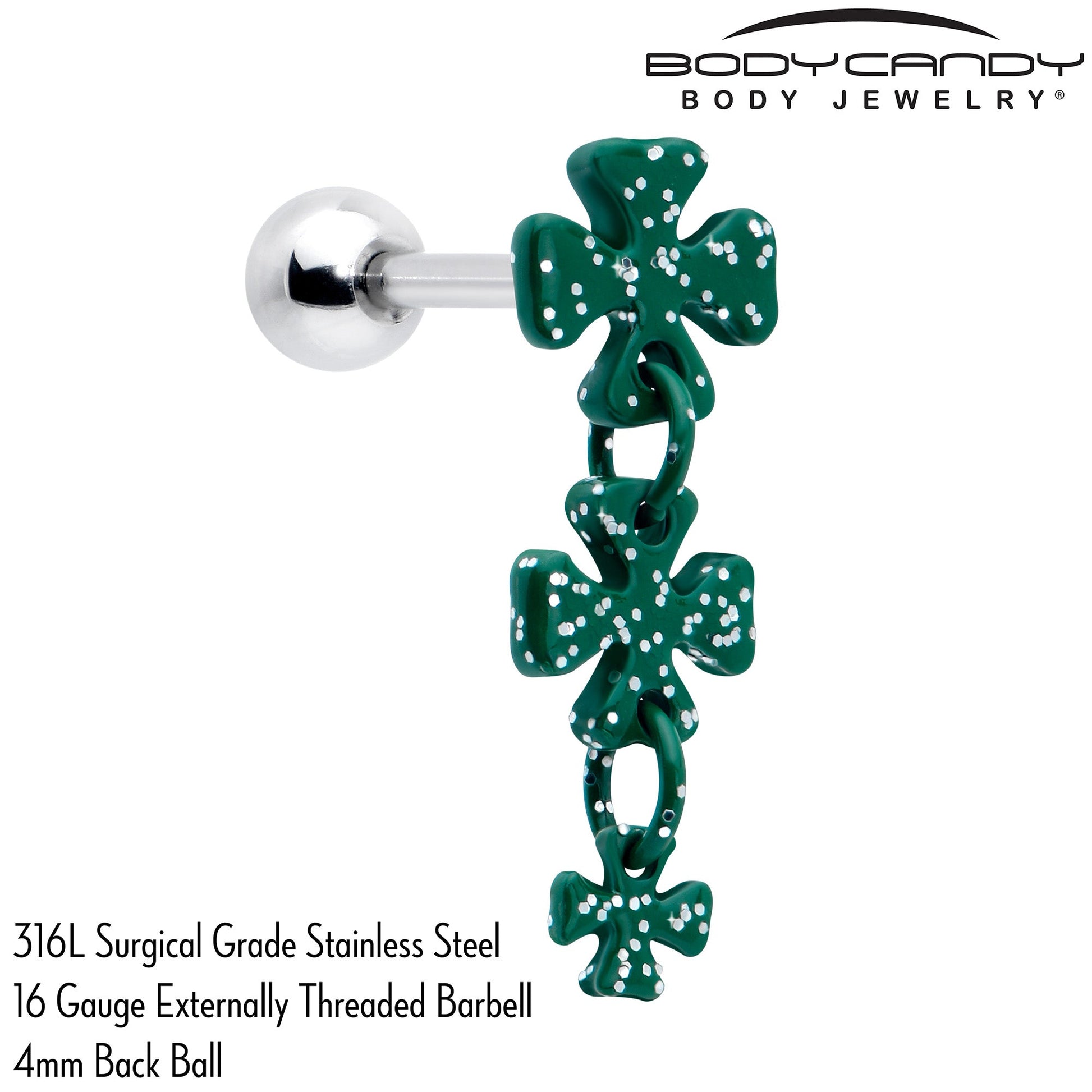 Get lucky with this 16 gauge shamrock tragus stud. It's made with an 8mm durable 316L surgical grade stainless steel straight barbell with a 4mm ball end. It features a green shamrock charm with white polka dot detailing that's sure to catch the eye. It also features two more dangling beneath it for added motion and style and you can rock it in multiple piercings including tragus, helix, and some conch piercings. Whether you're celebrating St Patrick's Day, expressing your love of all things Irish, or simply need a little luck, this lucky shamrock cartilage piercing jewelry is sure to leave you feeling like a winner.Specifications