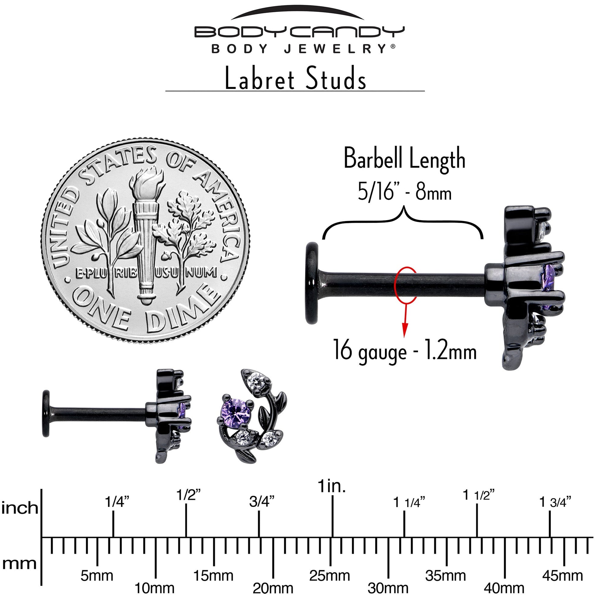 You'll be looking fine when you're rocking the vine on this 16 gauge lip ring. It's made with an 8mm black PVD over 316L surgical grade stainless steel straight post with a flat disc end. It features a leafy vine charm, with the leaves set with purple and clear gems for a gorgeous color contrast. It's further embellished with unadorned leaves for added visual impact and you can rock it in multiple piercings including lip, monroe, tragus, helix, and some conch piercings. This cartilage piercing jewelry is sure to grow on you.Specifications