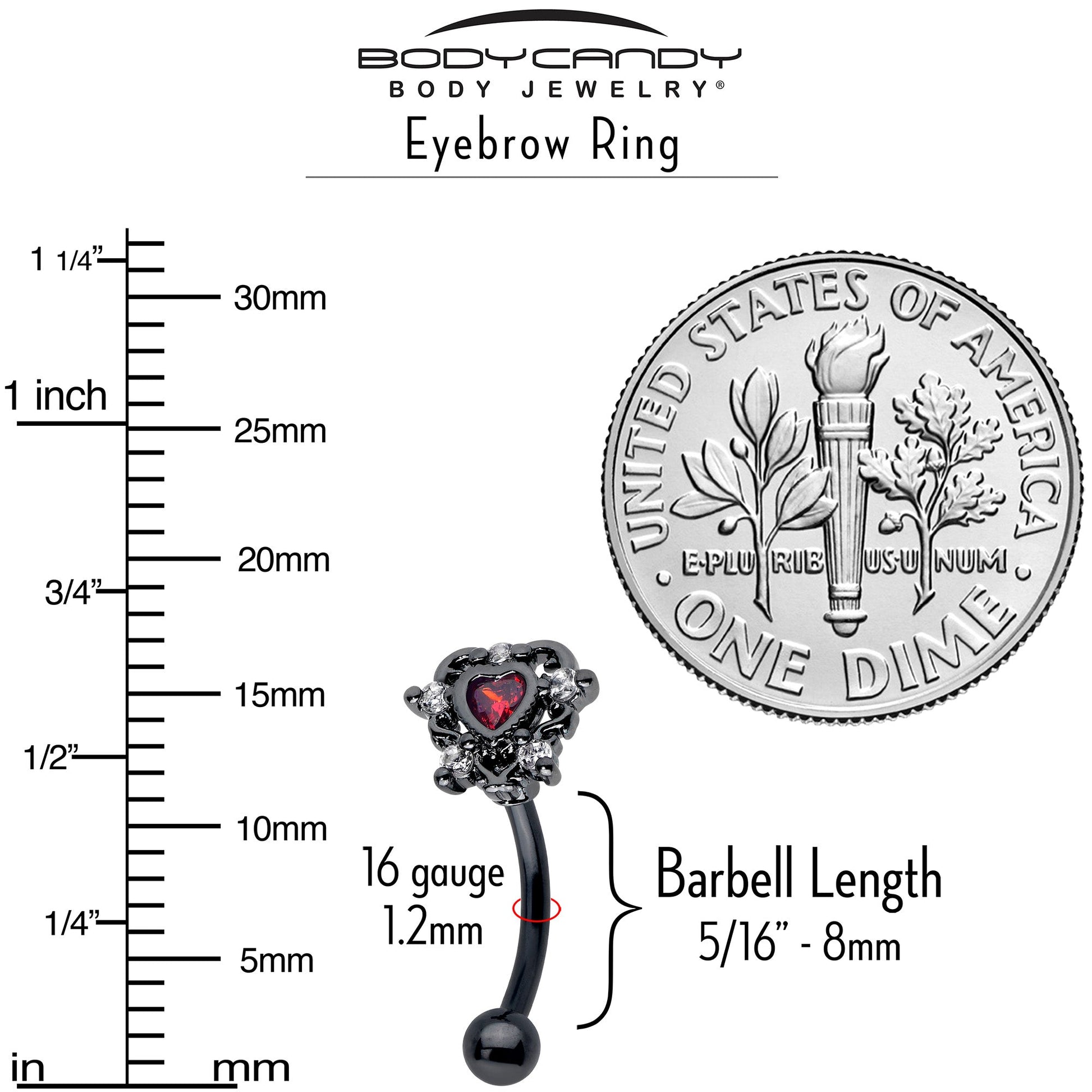 Get an antique-inspired look that will steal your heart with this 16 gauge eyebrow jewelry. It's made with an 8mm black PVD over 316L surgical grade stainless steel curved barbell with a 3mm bottom ball end. The top end features a double heart charm, with the outer heart embellished with clear cubic zirconia gems. The inner heart is composed entirely of a single red cubic zirconia gem and you can rock it in multiple piercings including eyebrow and rook. Wear your heart on your sleeve and in your piercings with this gothic cartilage piercing ring.Specifications