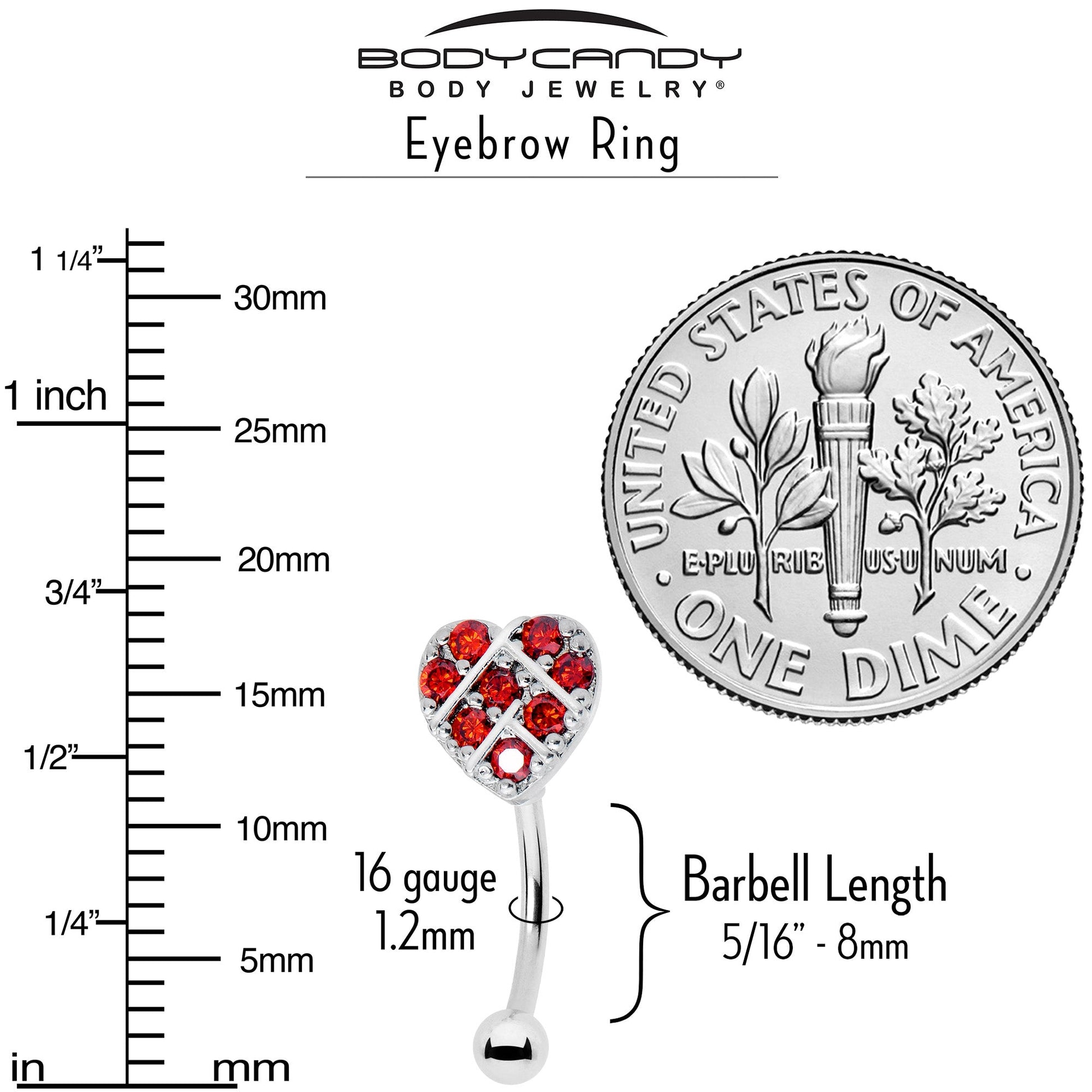 Get a luxe look of love with lattice this Valentine's Day with this 16 gauge eyebrow jewelry. It's made with an 8mm durable 316L surgical grade stainless steel curved barbell with a 3mm bottom ball end. The top end features a heart charm, with latticework detailing. Set in between each of the lines are red gems for an added touch of style that really takes this look over the top. You can even rock it in multiple piercings including eyebrow, rook, and some daith piercings. Fall in love with style when you're rocking this heart themed cartilage piercing jewelry.Specifications