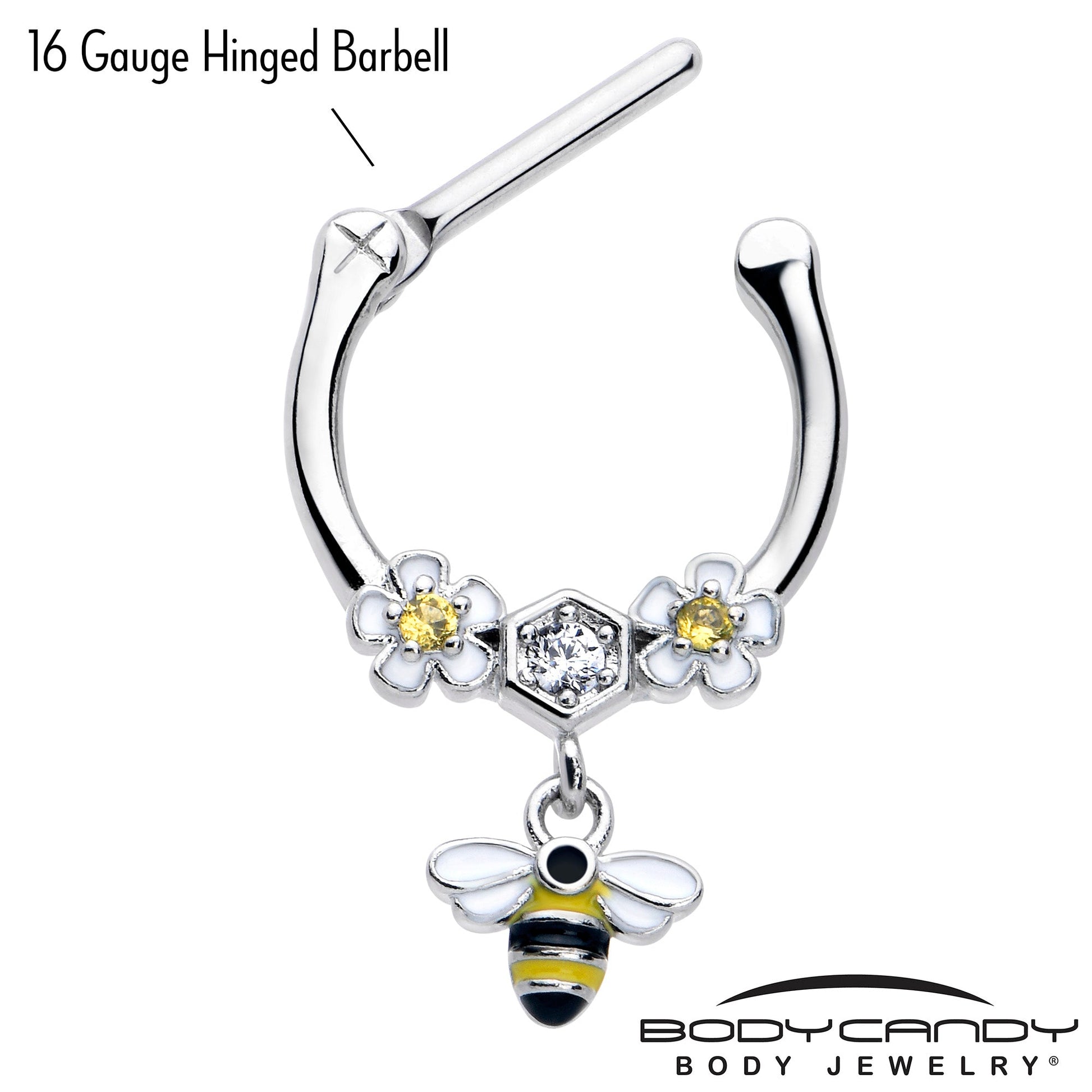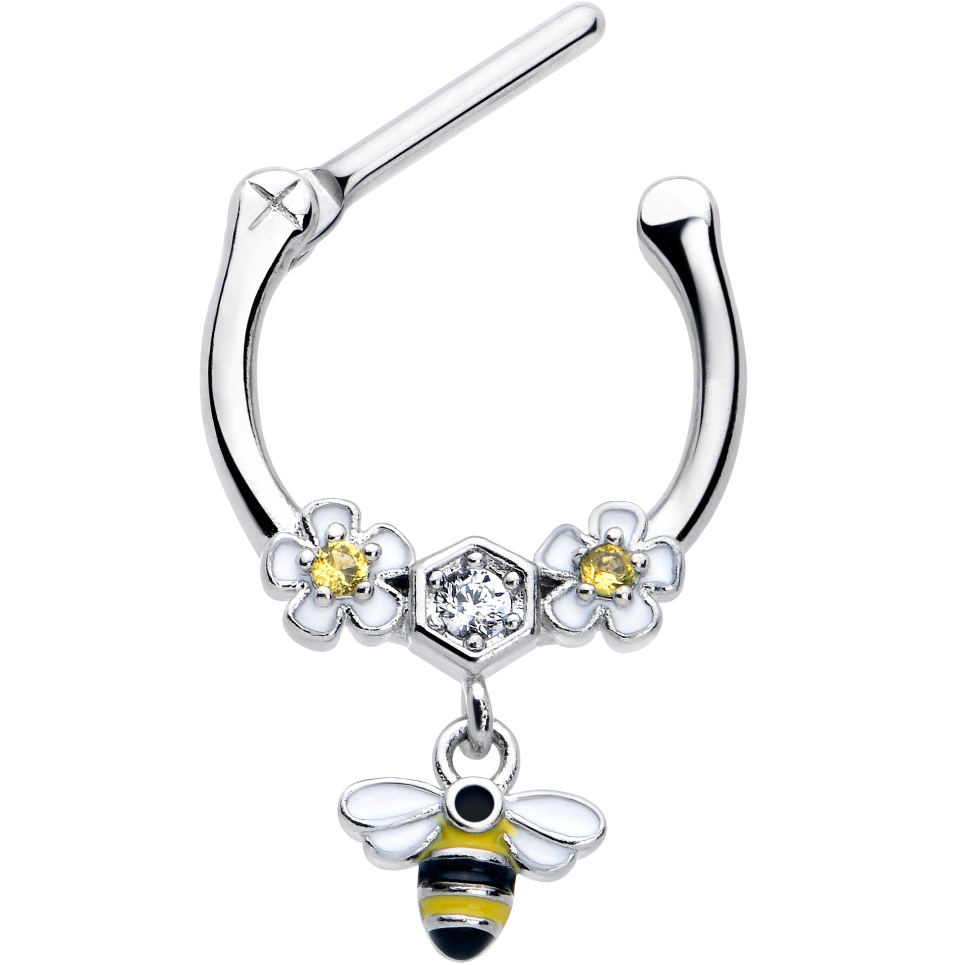 You'll bee the hottest bee in the hive with this 16 gauge septum ring. It's made with an 8mm durable 316L surgical grade stainless steel hinged straight barbell. It features a pair of white flowers with yellow cubic zirconia gem centers on each side of a single honeycomb charm with a clear cubic zirconia gem center. Dangling beneath is a bee charm with black and yellow stripes and white wings for a cohesive appearance. It also features a hinged, clicker design that makes insertion and removal a snap and you can even rock it in multiple piercings including tragus, helix, and some conch piercings. Whether you're a worker, a drone, or the queen, you'll be the sweetest looking honey in the room with this elegant honeybee cartilage piercing jewelry.Specifications