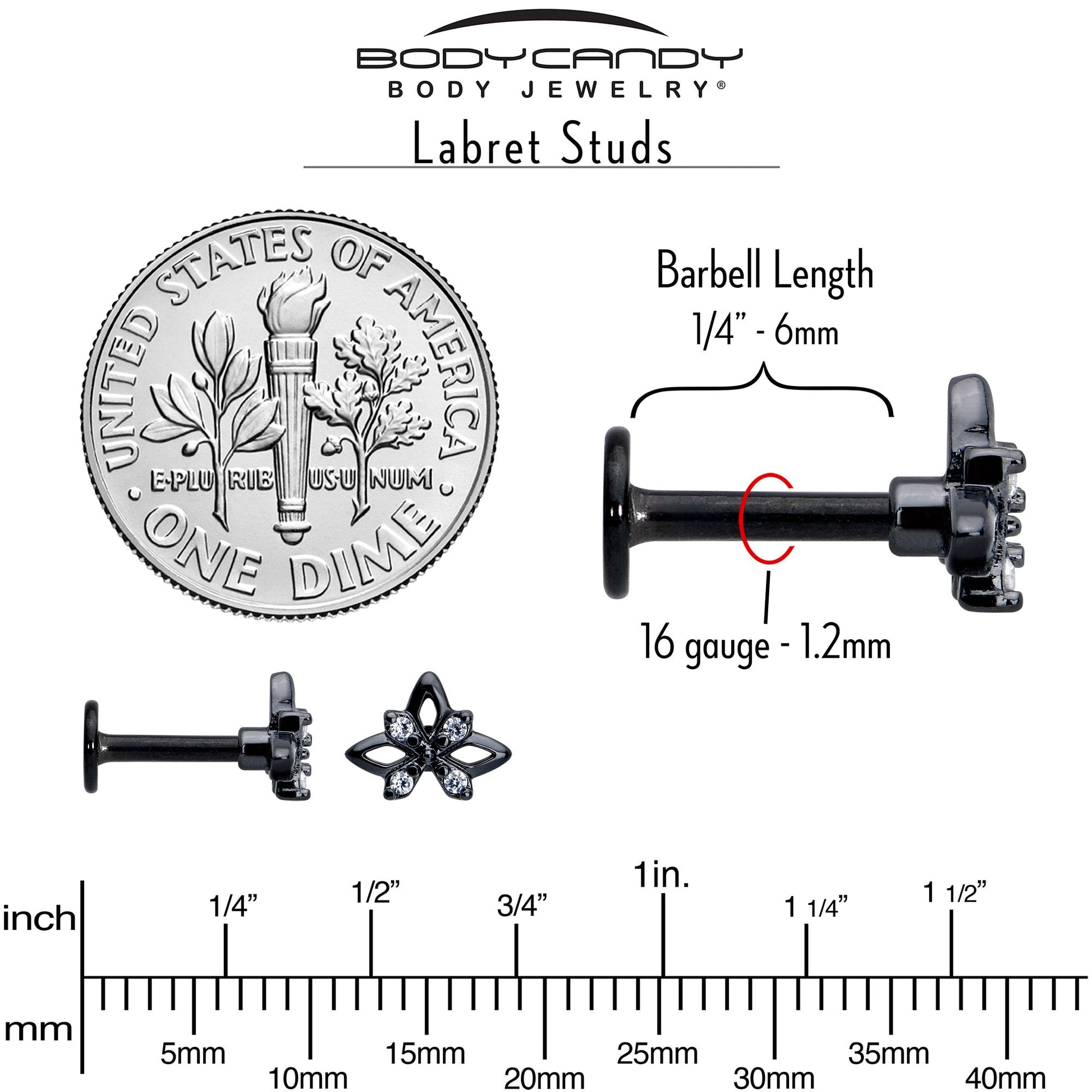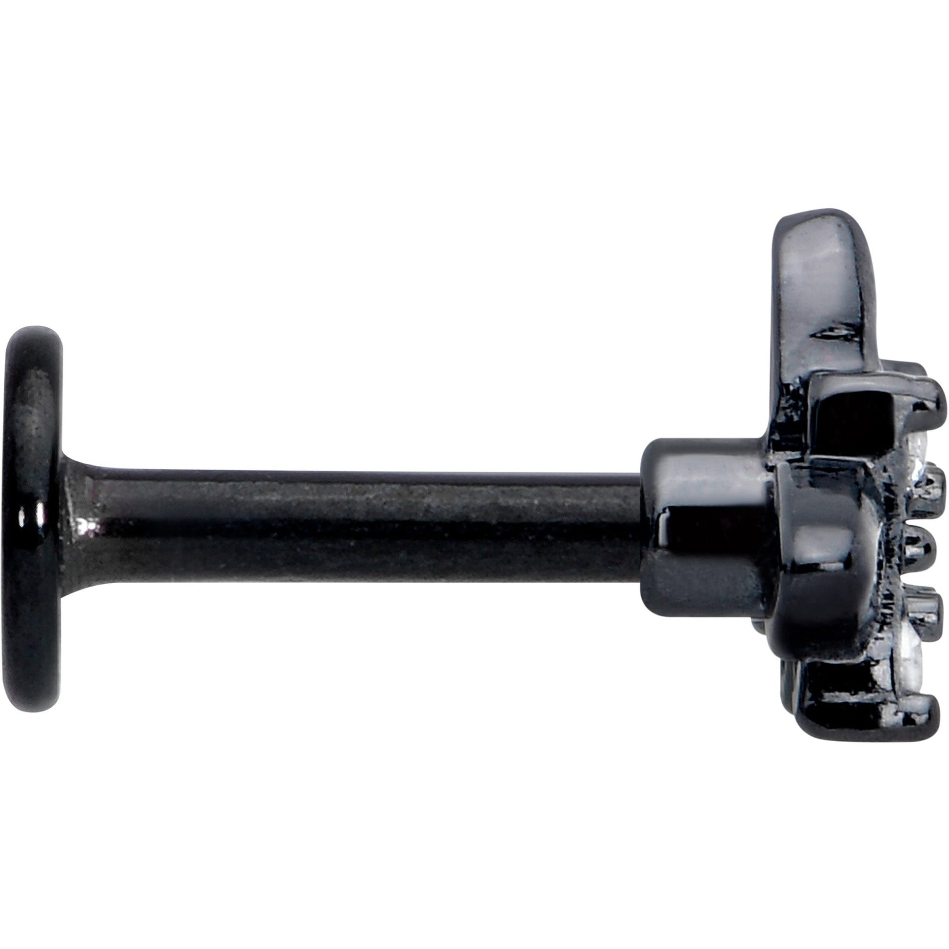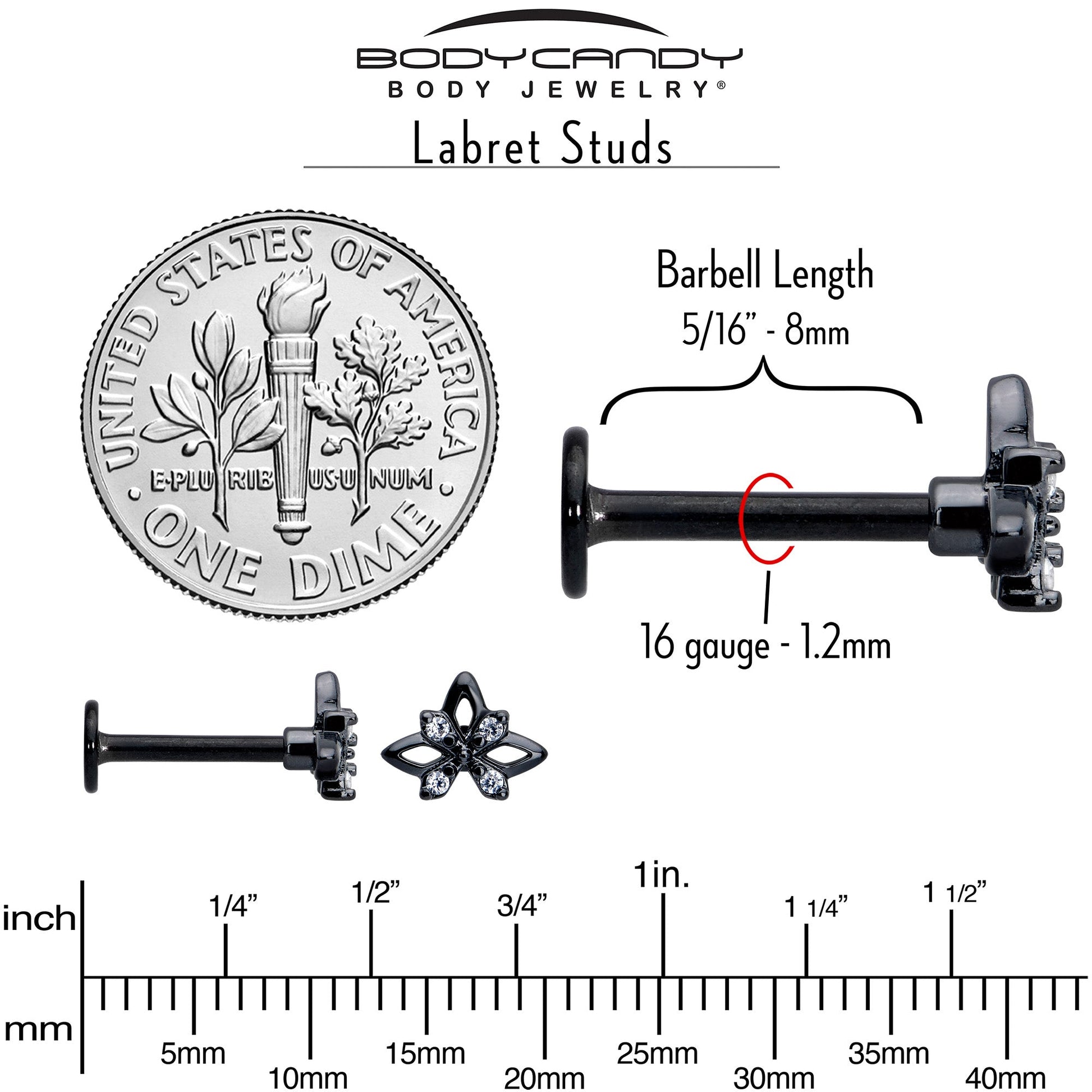 16 Gauge (1.2mm), Available in Lengthe Sizes of 1/4" (6mm) and 5/16" (8mm), Black PVD over 316L Surgical Grade Stainless Steel Straight Post, 7mm Charm End, Cubic Zirconia