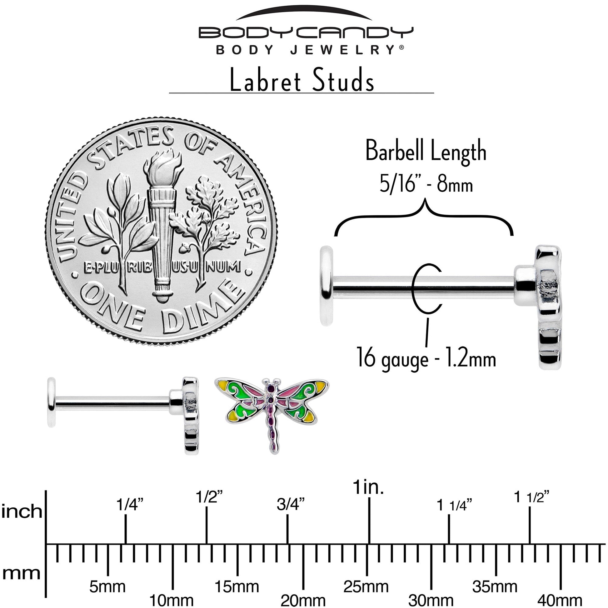 Check out this super comfortable 16 gauge flat back earring for 24/7 wear.. No need to take this earring out; keep it in for sleeping and naps. It's made with a durable 316L surgical grade stainless steel straight post with a flat disc end. The front end features a dragonfly charm, inlaid with green, yellow, pink and purple for a colorful look you can't miss. Spread your wings and take flight with this colorful dragonfly ear piercing jewelry..