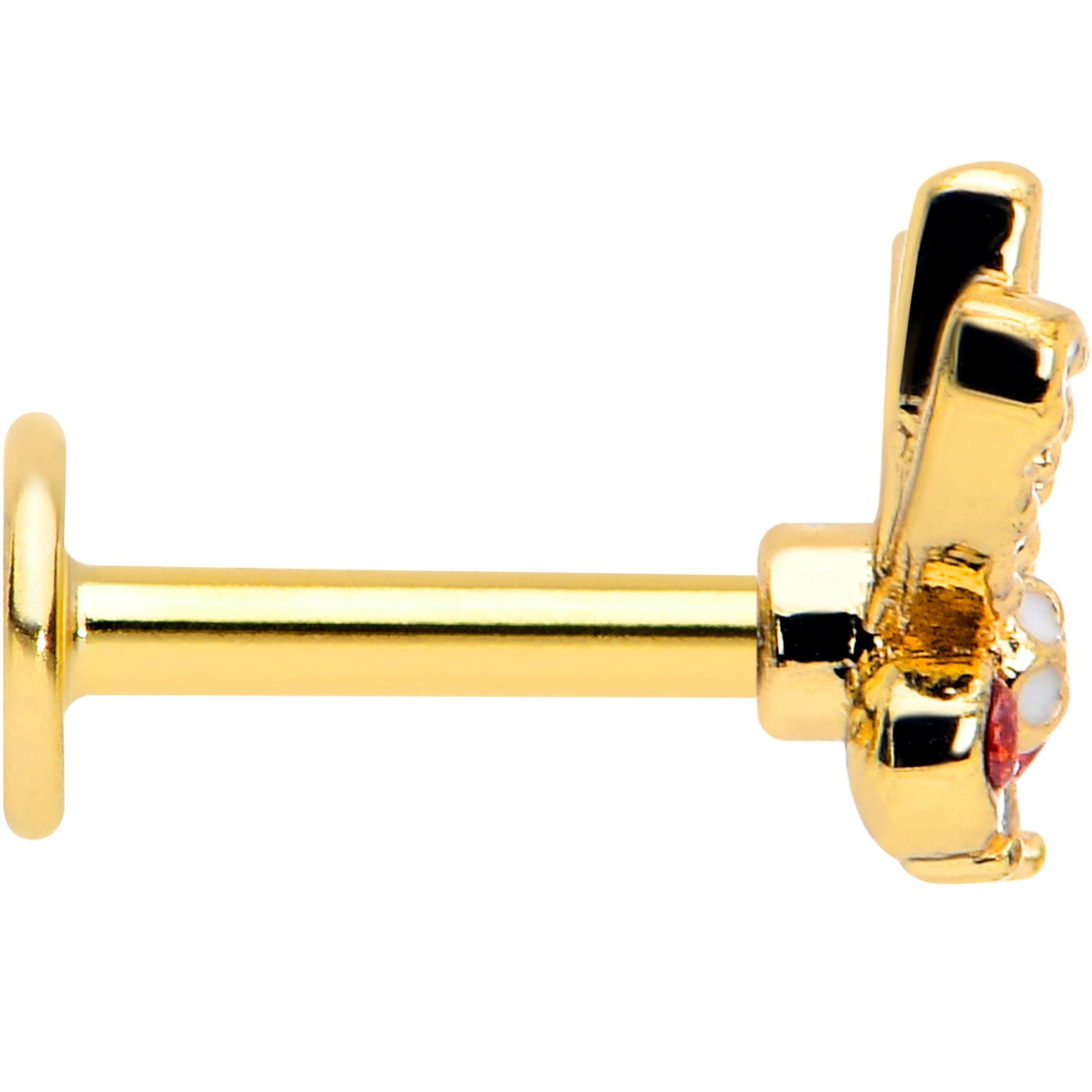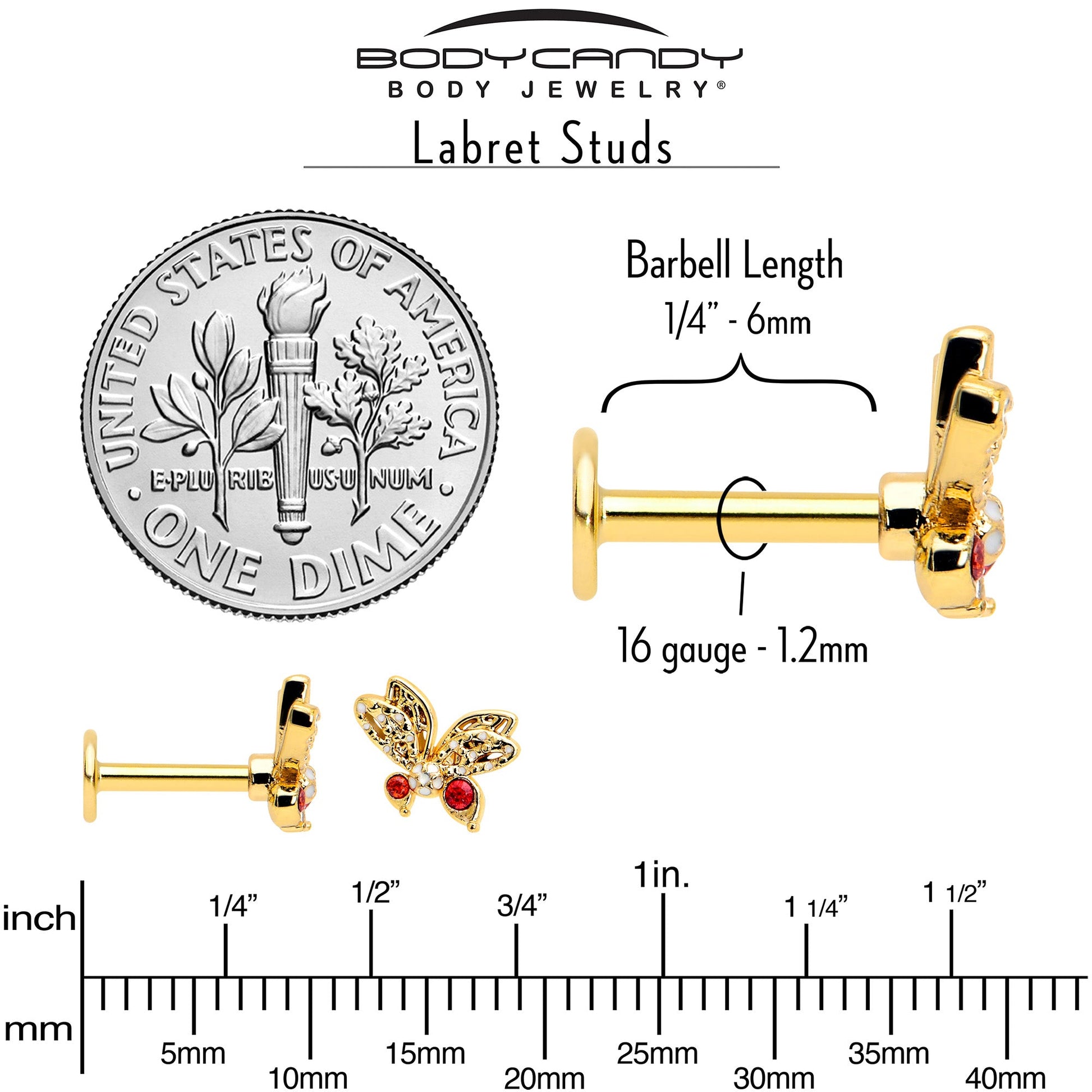 Check out this super comfortable 16 gauge flat back earring for 24/7 wear.. No need to take this earring out; keep it in for sleeping and naps. It's made with a 6mm gold tone PVD over 316L surgical grade stainless steel straight post with a flat disc end. It features a butterfly charm, paved with clear cubic zirconia gems for an eye-catching look that is sure to get noticed. It is further embellished with larger red cubic zirconia gems for a touch of dramatic color and style. Let your look steal the show with this delightfully dramatic butterfly ear piercing jewelry.