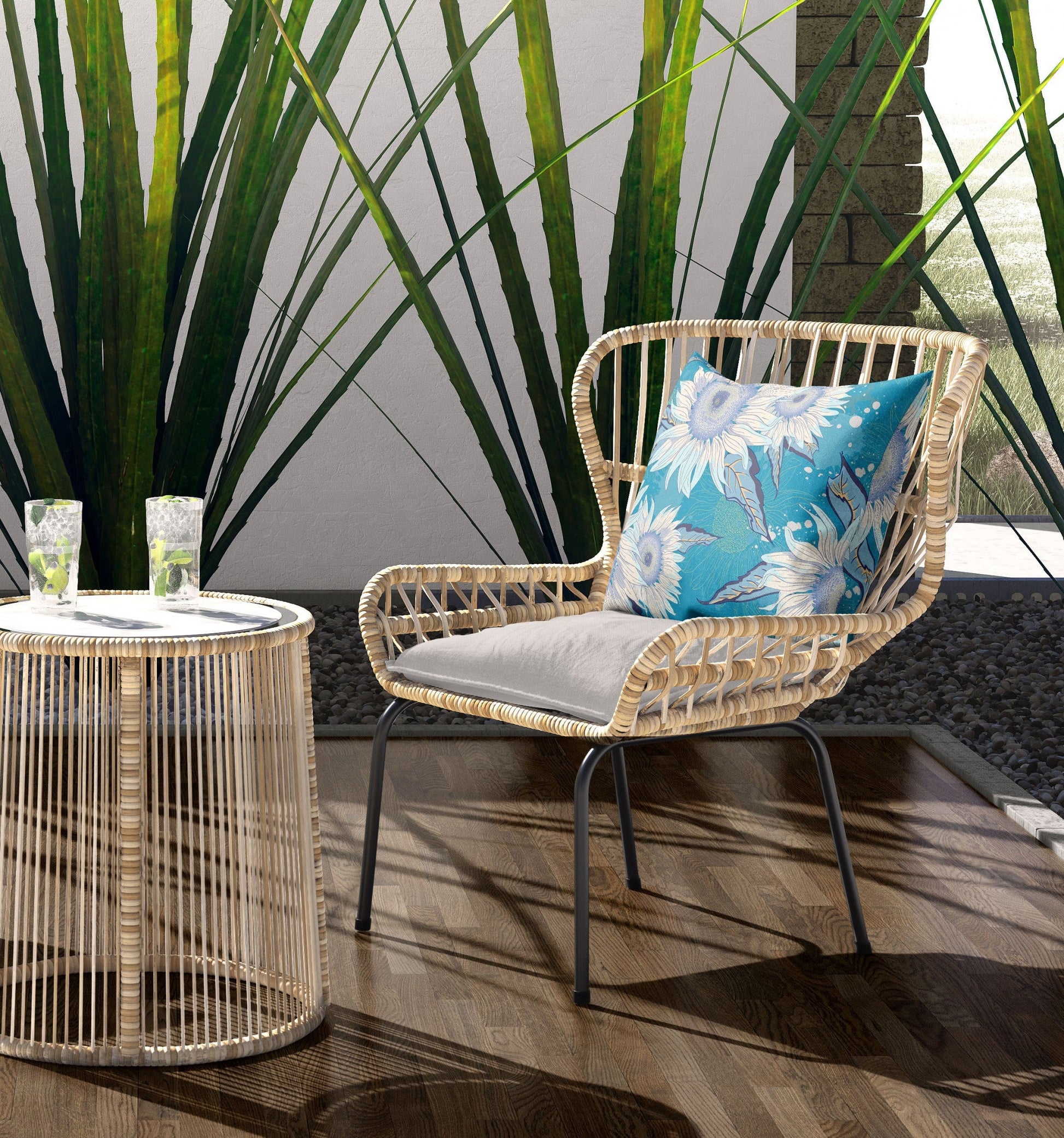 Lend a pop of color to your modern living space with this Aqua White Sunflower Indoor Outdoor Throw Pillow. Laden with large sunflower prints in white on a relaxing aqua-toned base, this decorative pillow is the perfect combination of idyllic and grandiose. Enveloped in a soft broadcloth fabric, the pillow boasts increased durability, making it suitable for both indoor and outdoor settings. The pillow includes a zippered removable cover for ease of cleaning and the plush polyfill insert makes it fluffy and cuddly. Accentuate the clean and neutral aesthetic of your modern or contemporary living room with the regal visual of this decorative throw pillow. 18” x 18” x 5”