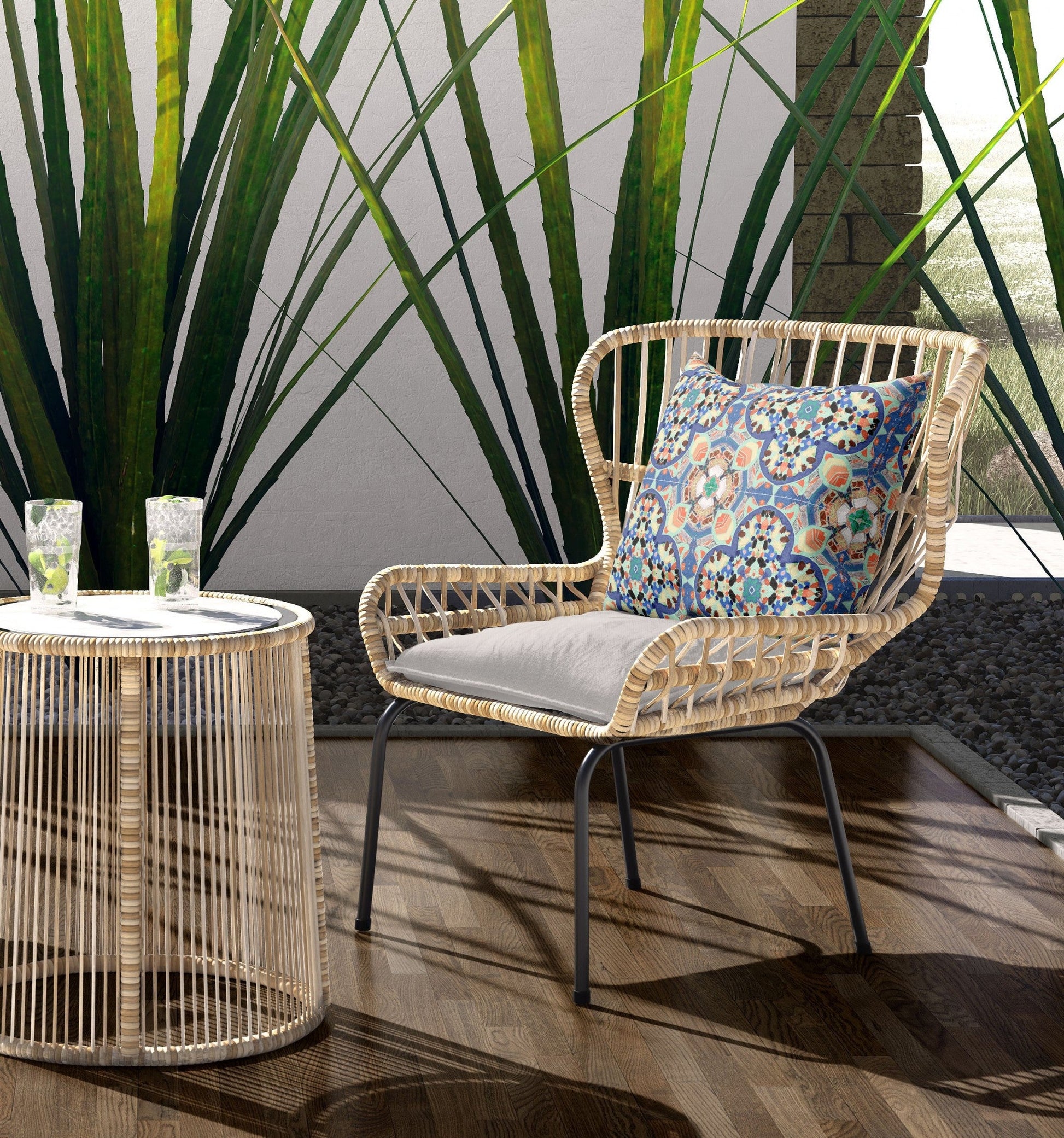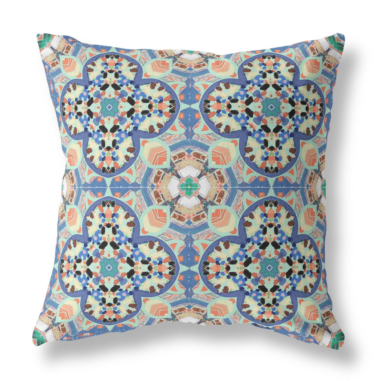 Bring the essence of boho into your living space with this gorgeous Blue Peach Cloverleaf Indoor Outdoor Throw Pillow featuring peaceful shades of blue and aquamarine intermingling with a cheery peach. The geometric cloverleaf patterns in the contrasting cool and warm tones create visual harmony. The blown pillow is crafted from durable broadcloth material with a soft and smooth surface texture, making it an ideal decorative accent for indoor and outdoor use. The soft and luxurious feeling when you lay on the pillow can be attributed to the 100% polyester fiber filling embedded into the cushion. Adorn your living space with the calming pop of colors on this throw pillow and feel the tranquility every time you brush your hand against its lush texture. 18” x 18” x 5”