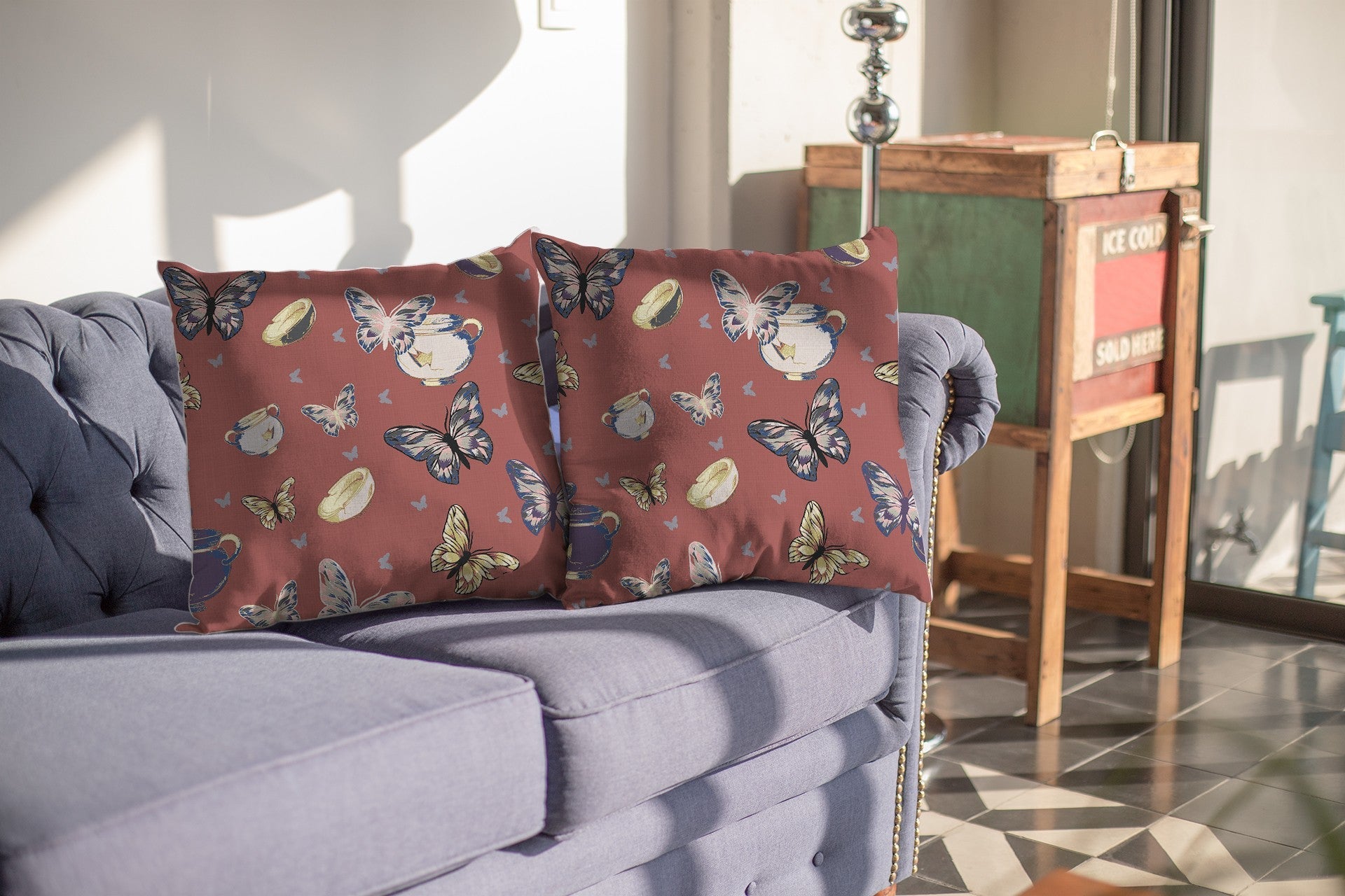 Bring some joy and happiness into your décor with this Copper Rose Butterflies Indoor Outdoor Throw Pillow that is sure to brighten up your home without overshadowing the whole look. The copper rose base is perfect for the uplifting blues and yellows of the butterflies and bowls to shine. crafted with premium quality broadcloth fabric to ensure a sturdy construction with a soft hand, giving a plush look to your indoor and outdoor settings. The high-quality digital print is made to stay flawless for years to come without losing its shine. Get the look and feel of a pure plush pillow that is hypoallergenic, completely cruelty-free, and eco-friendly. This blown pillow is filled with 100% polyester fiber insert, giving it a lavish springy feel with a fluffy nature to provide utmost comfort. If you’re looking for a beautiful yet lowkey element to lighten up your home, this beautiful throw pillow is sure to elevate your modern or casual vision. 18” x 18” x 5”