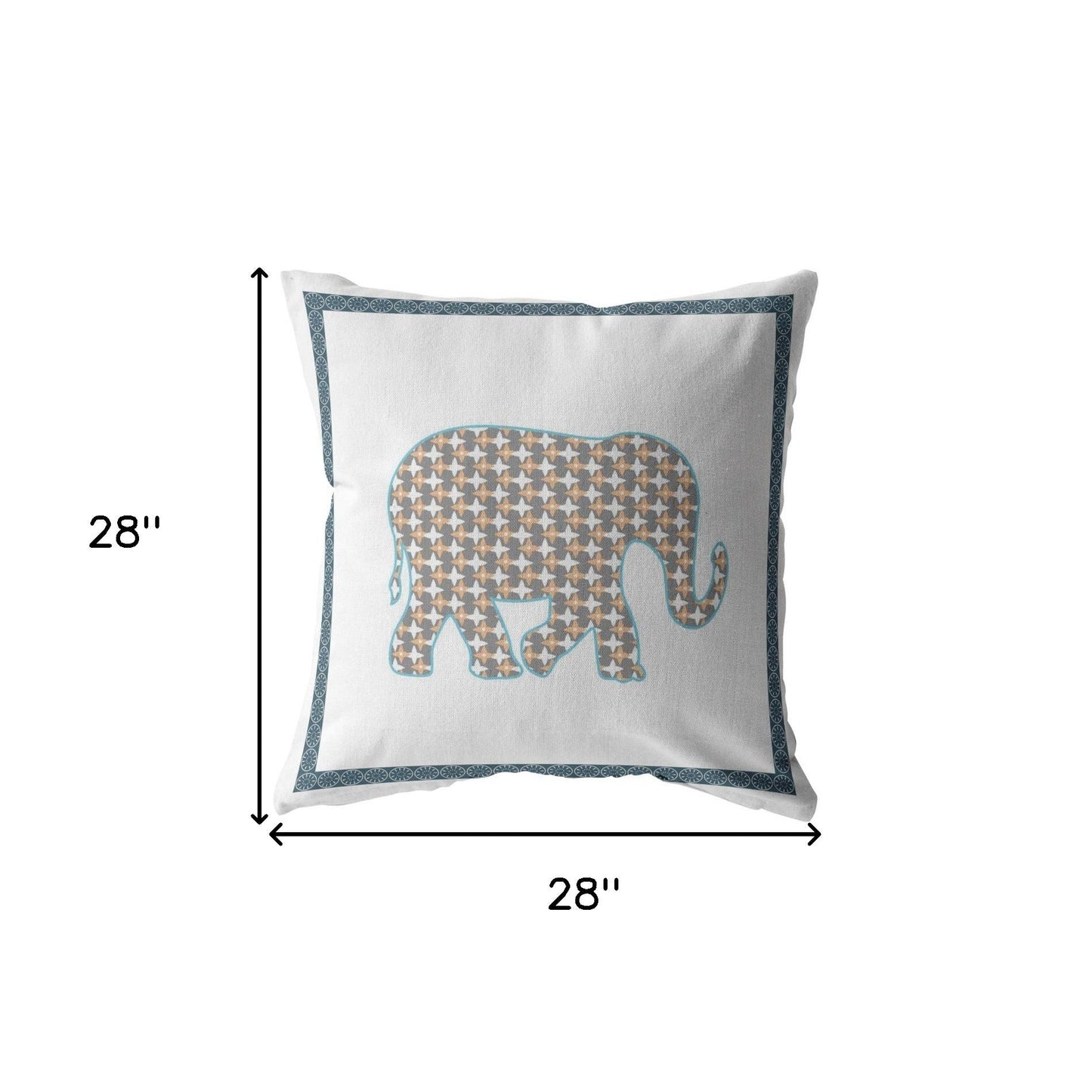 Combining simplicity and sophistication in an artistic expression, this opulent Gold White Elephant Indoor Outdoor Throw Pillow emanates a rich boho-chic aesthetic in its pattern and palette. With a gleaming gold and gray patterned elephant motif at the center and a spruce blue border over a clean white base, this pillow accentuates modernity with a bohemian flair. Crafted from premium broadcloth fabric, this piece ensures that you get the best quality in terms of looks and comfort while making it an ideal accent for indoor and outdoor use. This pillow is filled with 100% polyester fiber insert, giving it a lavish springy feel with a fluffy nature to maximize comfort. If you want to present a bohemian aesthetic in your home alongside a contemporary vibe, this decorative throw pillow will be the perfect piece to pair with your sofa set, bed, or couch. 18” x 18” x 5”