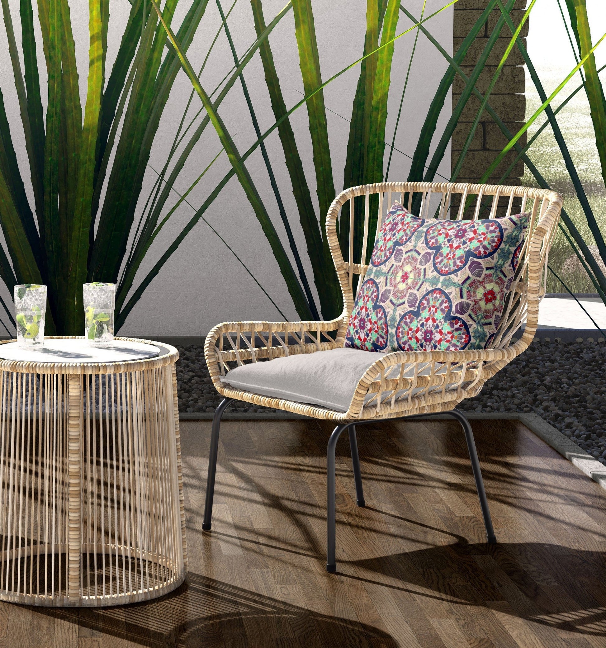 Make your home the embodiment of bohemian free-spiritedness with this Mauve Blue Cloverleaf Indoor Outdoor Throw Pillow and rejuvenate your contemporary décor. The calm mauve tones intermingling with the subtle blue and greens while the embellishments of red create a perfect meld of colors to make this pillow the quintessential piece to add to your home. Crafted from high-quality broadcloth fabric which is smooth and glossy to give a plush appearance to the pillow while being durable to last for a long time. The versatile blown pillow is also soft to the touch, given its lush polyfill insert, making it super fluffy and comfortable to be used in both indoor and outdoor spaces. The pillow itself is a piece of art with its intricately designed patterns under the well-thought-out color combinations, and it is a must-have for any boho-chic living space needing a cheery decorative accent. 18” x 18” x 5”