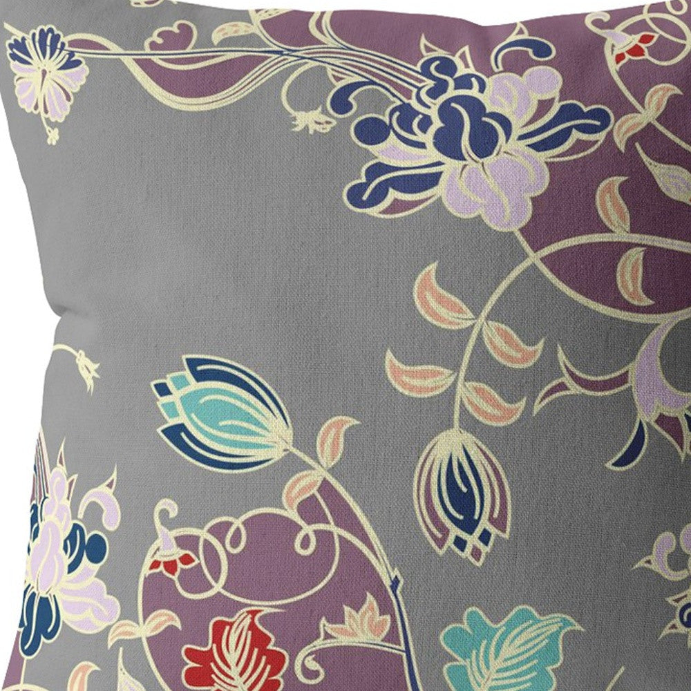 Capture the spirit of a classic-modern styling with this Purple Gray Garden Indoor Outdoor Throw Pillow that features old-world floral detailing in fashion-forward hues. The alluring garden theme features multicolored floral vines over a trout gray and dusty purple base creating a beautifully bold combination. crafted with premium quality broadcloth fabric to ensure a sturdy construction with a soft hand, making it an ideal accent to add a plush look to your indoor and outdoor settings. This blown pillow features a high-quality polyfill insert from optimum comfort while making the piece super fluffy for a luxurious feel on the touch. If you want a fusion of trend and tradition into your living space without being too loud, look no further than this stunning decorative pillow for your modern or bohemian ensemble. 18” x 18” x 5”