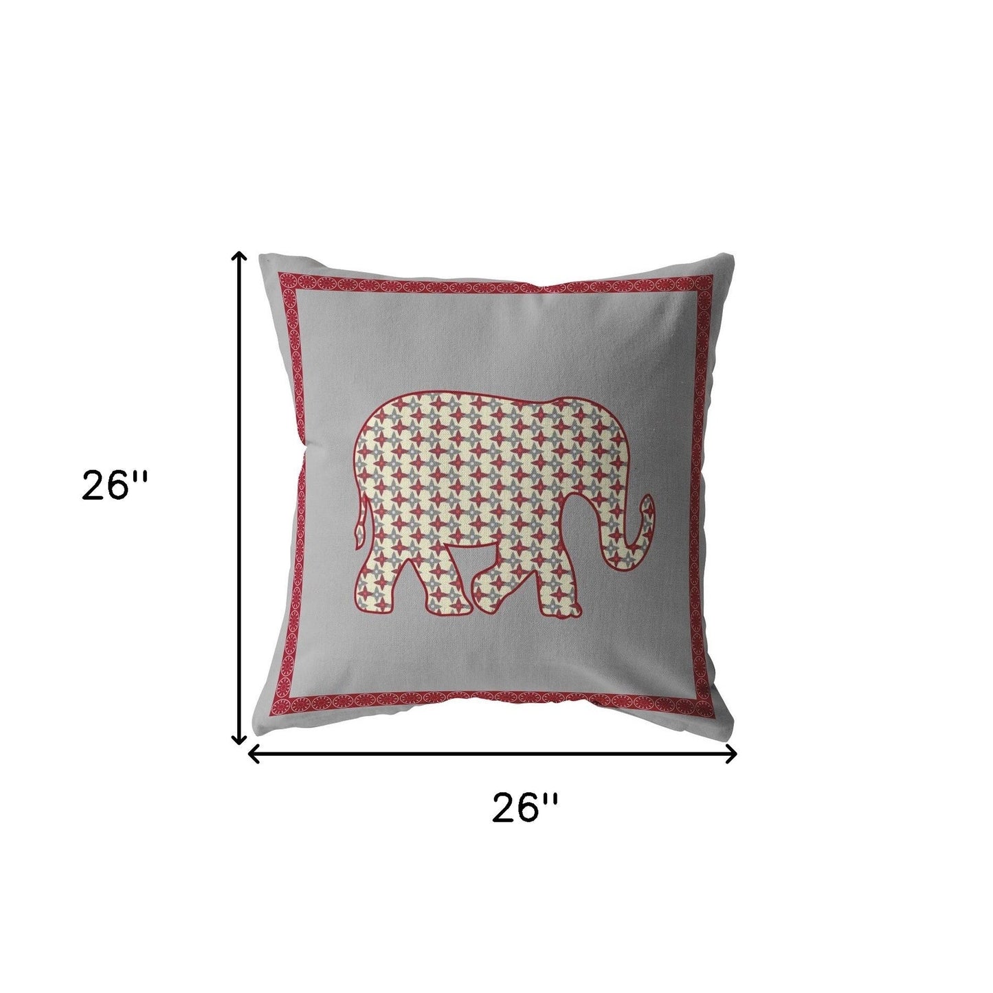 Elicit an aura of class and sophistication with this stunning decorative Red Gray Elephant Indoor Outdoor Zippered Throw Pillow. The centered diamond motifs along with the borders, all in a beautiful crimson red, create a visually captivating artwork of an elephant over a neutral dove gray base. Made with premium broadcloth fabric that is durable and robust to bring you the ideal accessory for indoor and outdoor settings. The super plush pillow features a neat zippered closure and comes with a fluffy polyfill insert so that every resting moment revitalizes you to the fullest. Tying together stunning visuals and enticing hues in a modern design, this decorative pillow is meant to be an eye-catching accent to your room. 18” x 18” x 5”