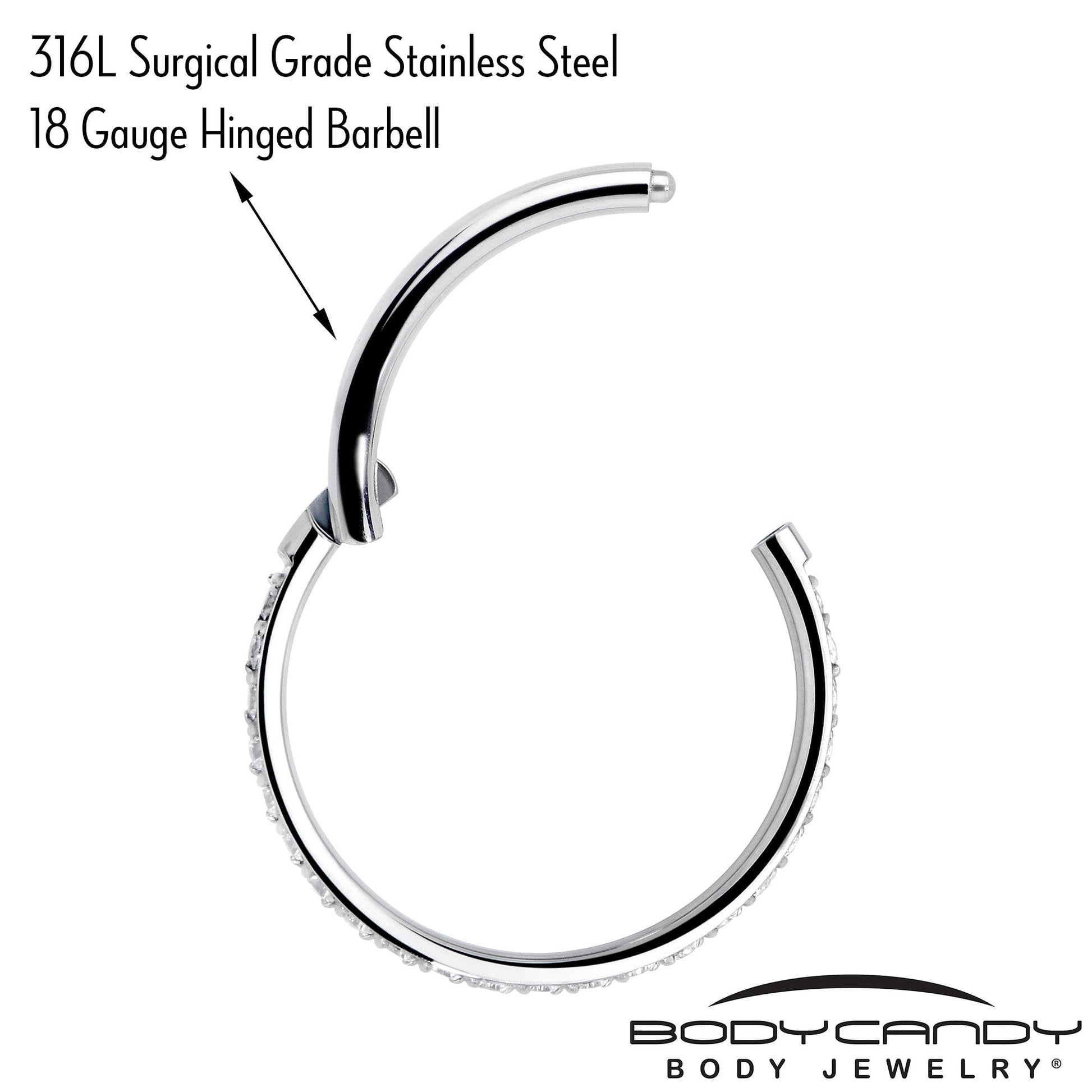 Add a touch of simple glamour to your look with this 18 gauge hinged nostril ring. It's made with a 10mm hypoallergenic ASTM F-136 implant grade titanium hinged circular ring. The rim is paved with tiny clear cubic zirconia gems for a look that is luxurious. It also features a non-removable, hinged segment that makes insertion and removal a breeze and you can rock it in multiple piercings including nostril, some helix, and some conch piercings. Add some sumptuous style to your look with this gorgeous glamorous nose piercing jewelry.Specifications