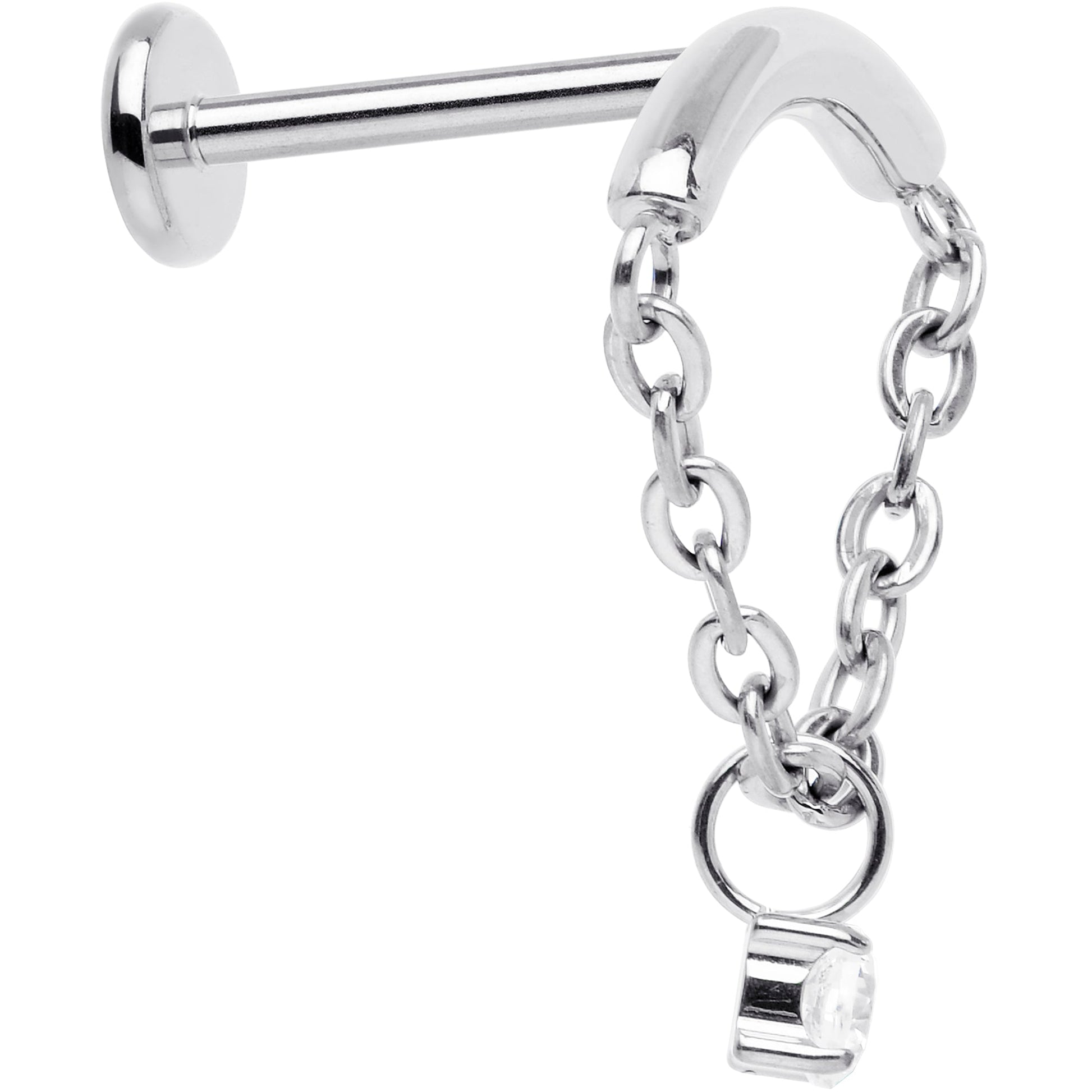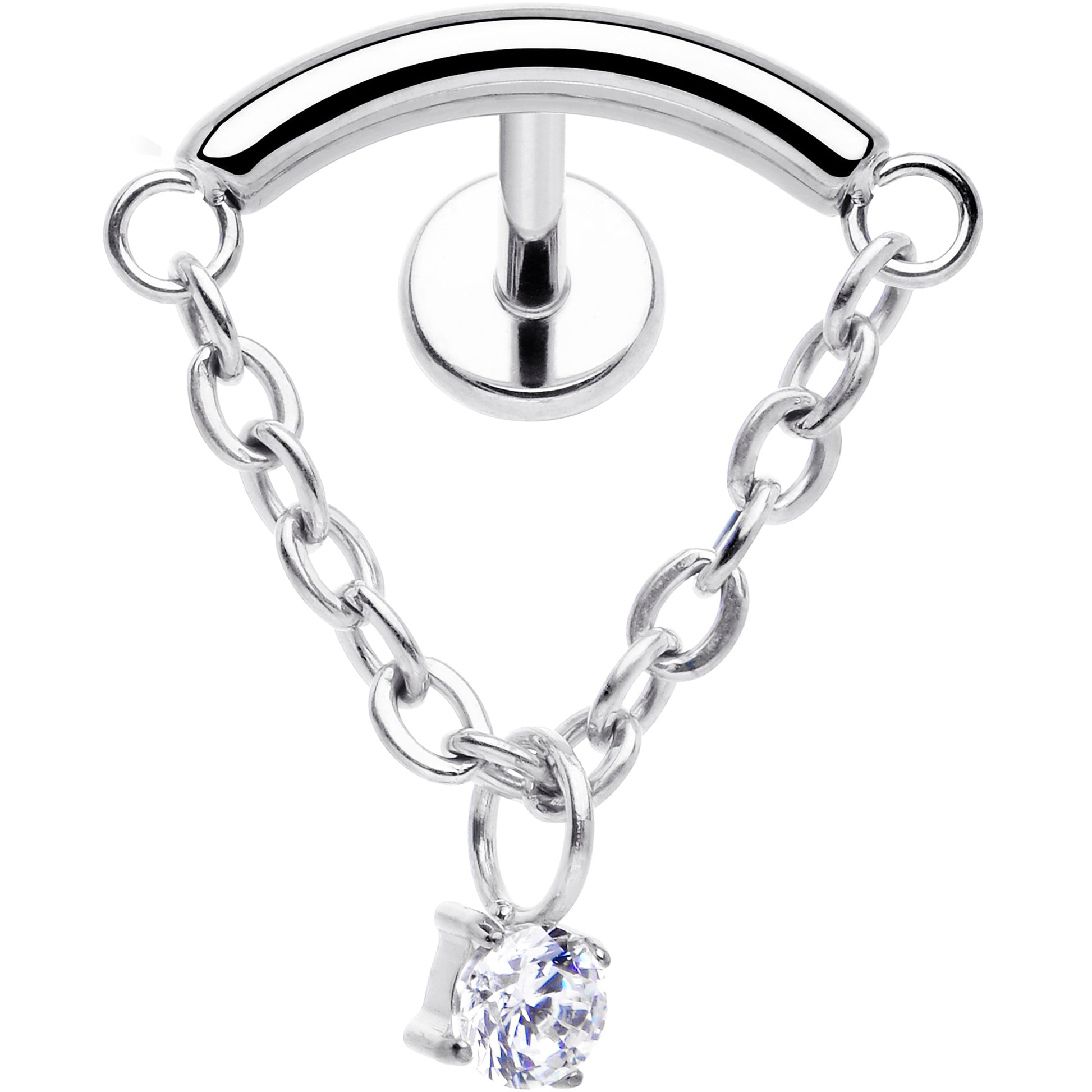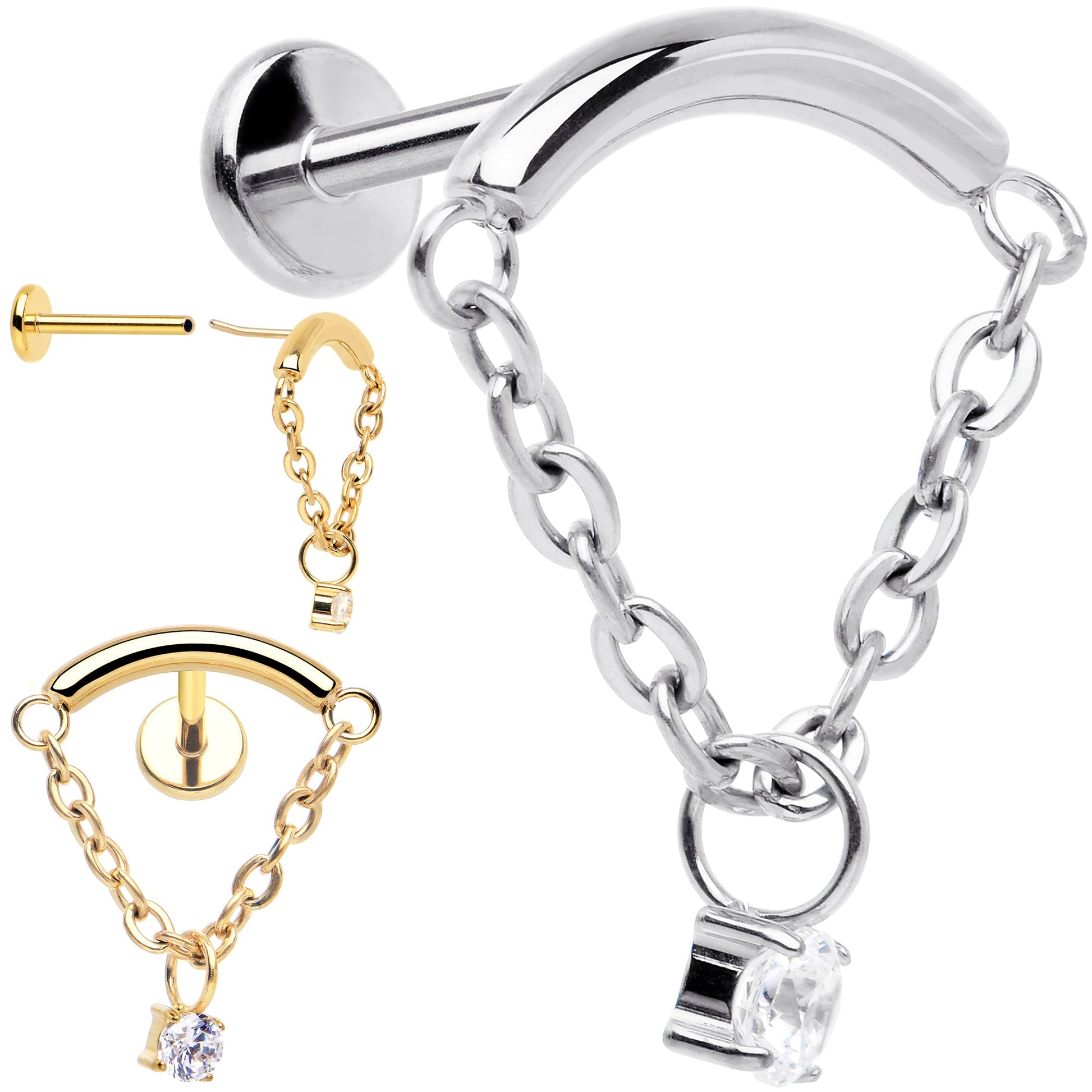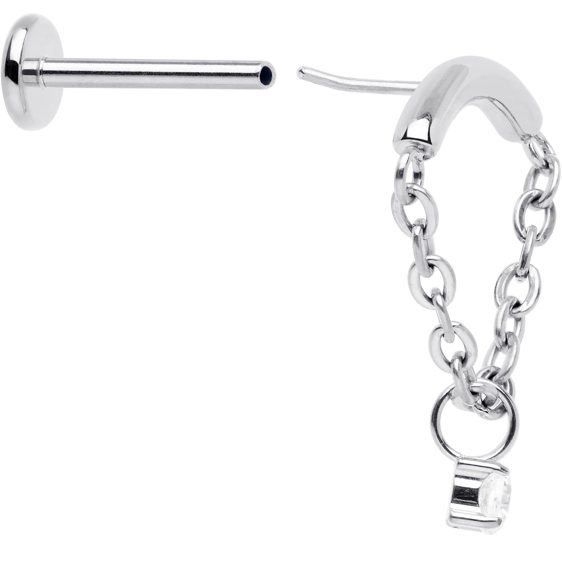 Add some peekaboo style to your look with this 18 gauge cartilage jewelry. It's made with an 8mm hypoallergenic implant grade ASTM F-136 titanium straight post with a flat disc end. The other end features a simple arch design with a loop of dangle chain that supports a color cubic zirconia gem. It also features a threadless design for maximum comfort on insertion and removal. Don't hide your hidden helix, let it take center stage with this elegantly simple hidden helix jewelry.