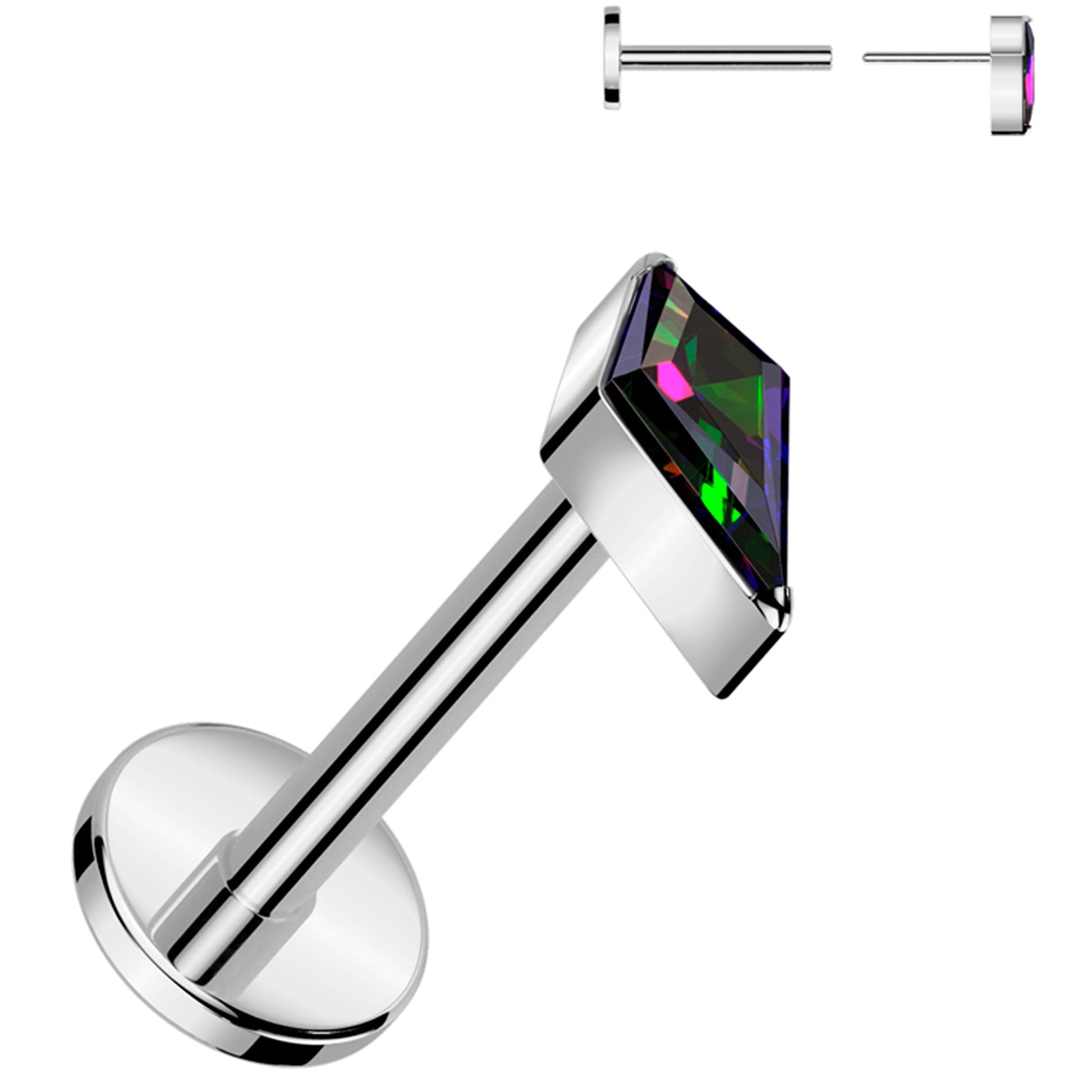 Timeless style and striking colors mean this 18 gauge body jewelry is always in style. It's made with an 8mm ASTM F-136 implant grade titanium straight post with a flat disc back. It features a spear shaped top, set with a vitrail cubic zirconia gem and featuring a threadless design, for maximum comfort on insertion and removal and making it easy to change the end. Best of all, you can wear it in multiple piercings including earlobe, and nostril piercings. Classic jewelry and modern style make this elegant flat back earring a a winner.Specifications