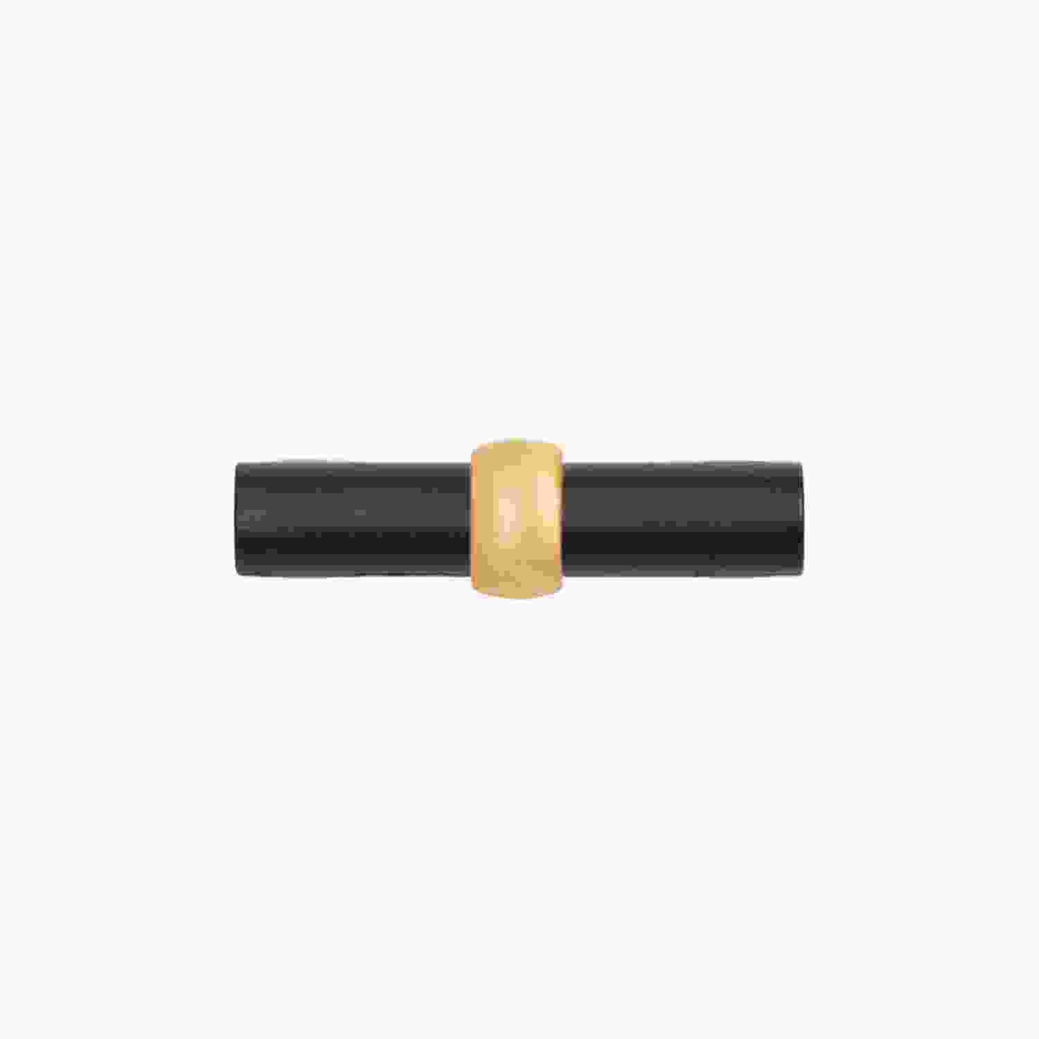 The Matte Black finish coordinates with most black interior elements. The true black color is sealed with a low sheen lacquer. Here it is shown in combination with the Brushed Golden Brass finish, which coordinates with most Brass and Gold finishes. The color is a rich brass tone and the finish features lengthwise brushing and a stain sheen.