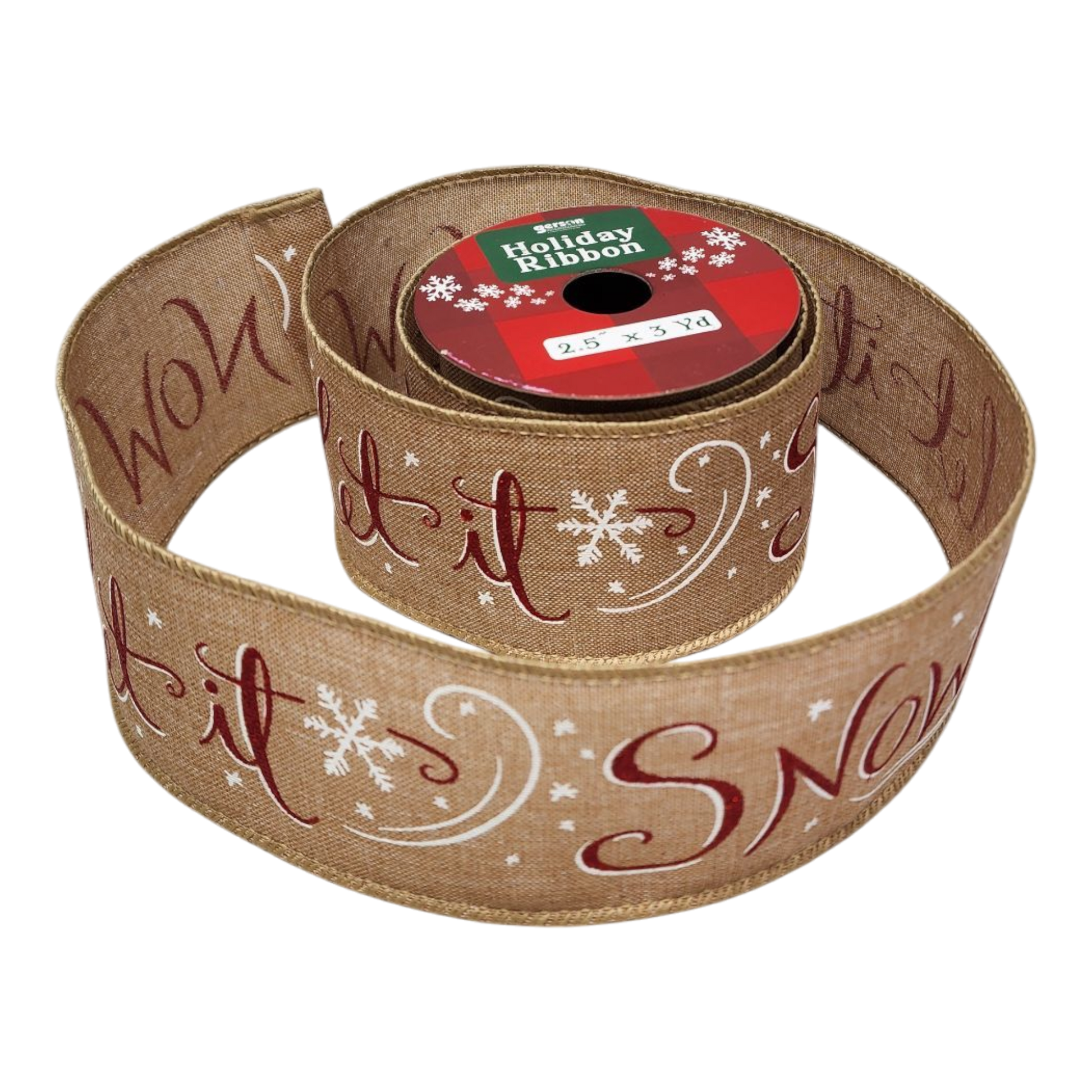 Celebrate the winter season with our charming wire edge ribbon, measuring 2.5 inches wide and 3 yards long. This delightful ribbon features the whimsical phrase "Let It Snow" elegantly scripted in a rich burgundy hue against a warm, natural burlap background. Adorned with playful snowflakes, this ribbon captures the cozy spirit of the holiday season while adding a touch of rustic charm to your decor.