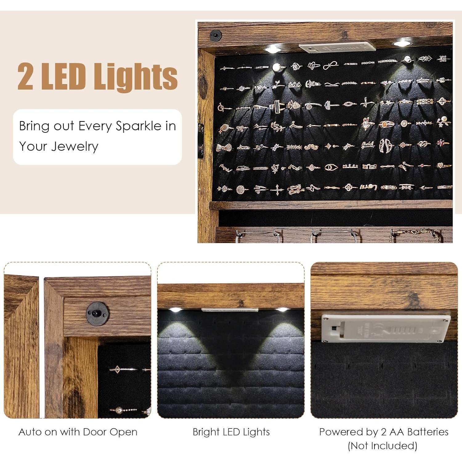 - Special Features: Full length mirror, Large jewelry storage capacity, 2 LED lights, Black velvet liner, Wall mounted or door hanging