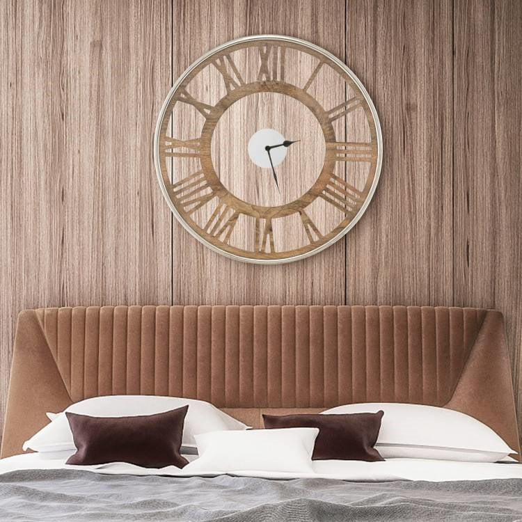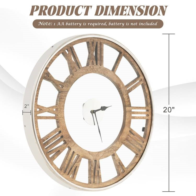 This 20-inch Classic Farmhouse Natural Wood Roman Numerals Wall Clock features a silent non-ticking clock design, allowing you to enjoy a peaceful environment without any annoying tick-tock sound. Moreover, the smooth quartz sweeping movement also guarantees accurate timekeeping. Measuring 2" in deep, this 16"/ 20" wall clock can elevate the aesthetic appeal of any room and boast a stylish design that blends seamlessly with a wide range of room decoration. Whether it's for the living room, bedroom, office, or study, this clock will add a touch of elegance to any indoor space. Crafted with the utmost attention to detail, this wall clock is made of high-quality materials that exhibit excellent corrosion resistance and oxidation-resistance. Furthermore, its durable construction ensures long-lasting durability, providing accurate and dependable timekeeping for years to come. Surprise your loved ones with a truly unique and stylish decorative clock for their home. This clock combines stunning design with exceptional quality, making it the perfect gift for any special occasion. Whether it's a housewarming party, anniversary, or birthday celebration, this clock is sure to impress and delight. Skip the hassle of assembly with this clock that comes ready to use. All you need to do is use the convenient back slot to easily hang it on the wall. Additionally, this clock requires 1 standard AA batteries (not included).