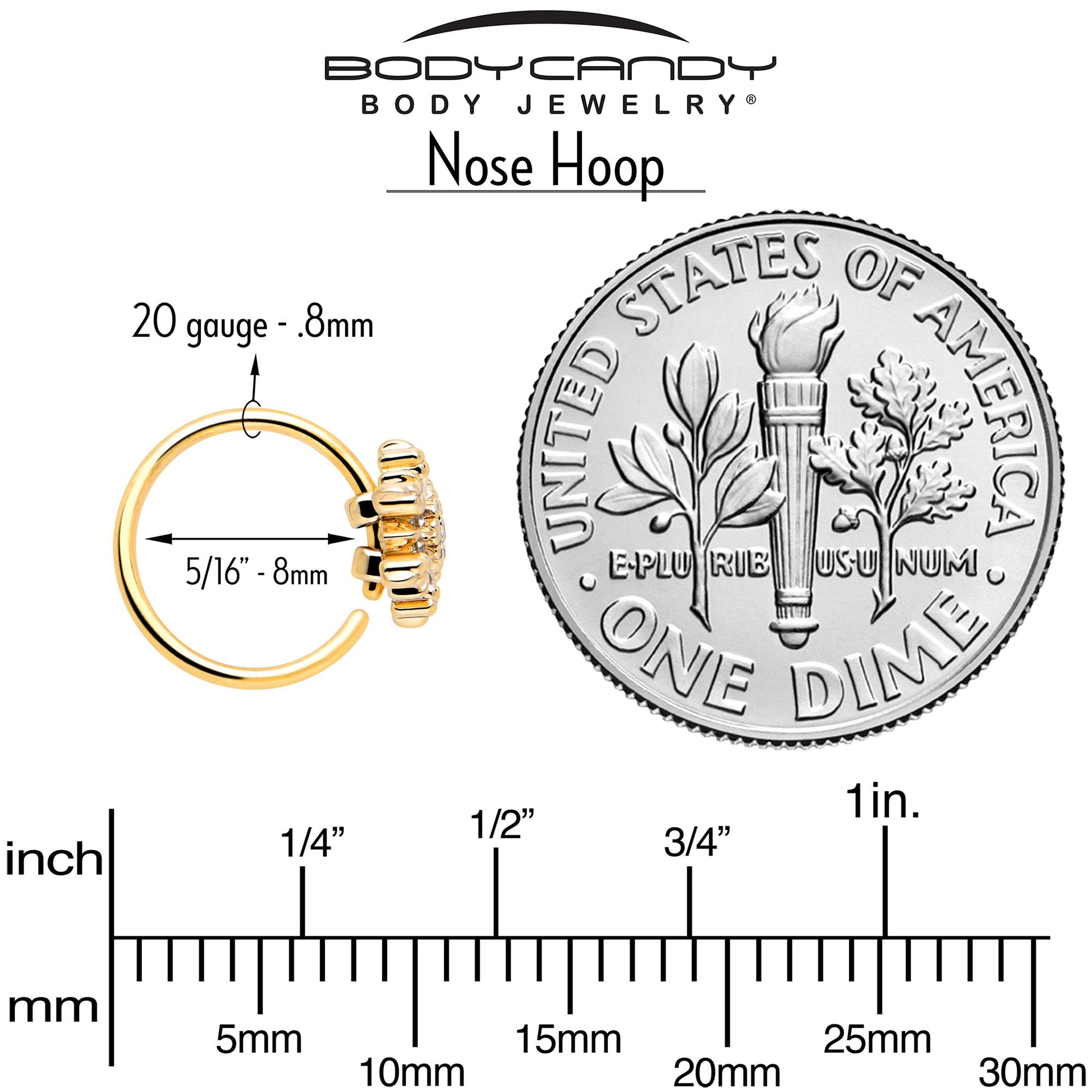 20 Gauge (.8mm), 5/16" (8mm), Gold Tone PVD over 316L Surgical Grade Stainless Steel Circular Ring, Cubic Zirconia