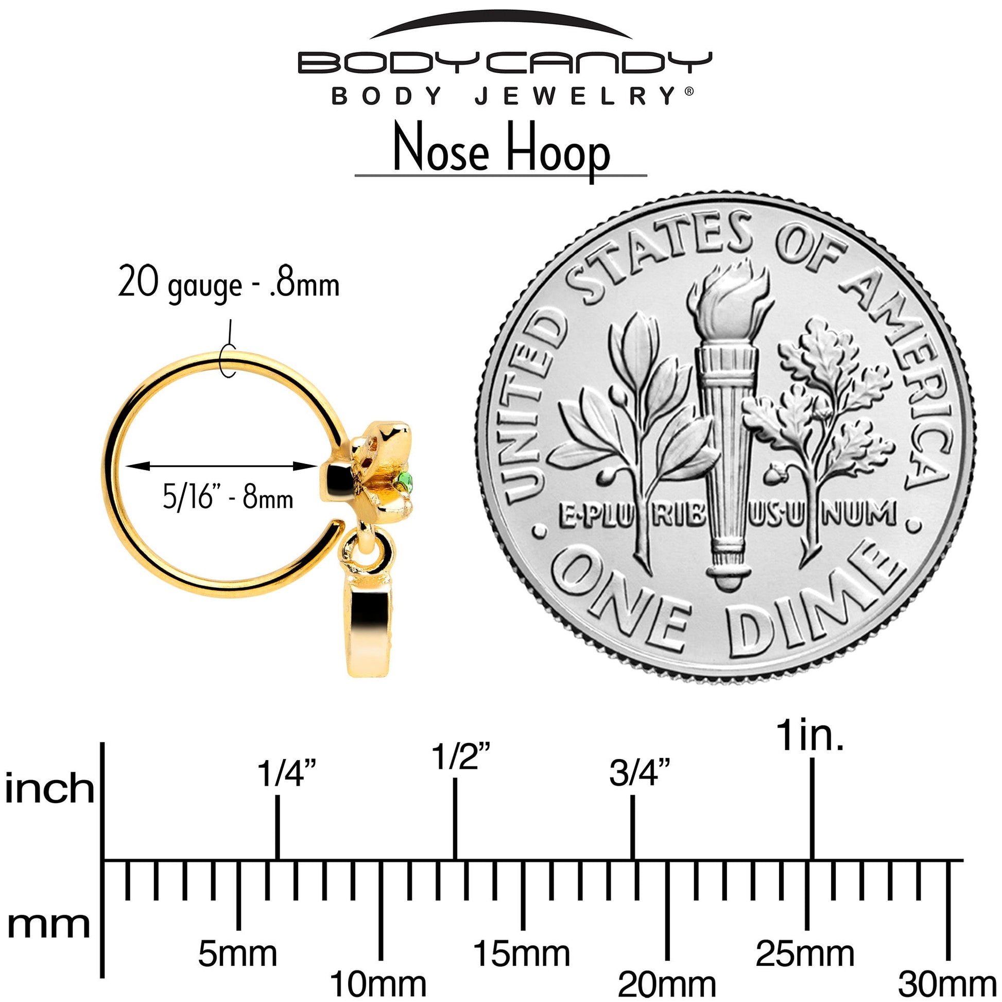 The delightful dragonfly on this 20 gauge nostril ring is so lovely it is almost magical. It is made with an 8mm gold tone PVD over 316L surgical grade stainless steel circular ring. It features a dragonfly charm, set with a green gem body and matching green and clear gems on the lower wings for lovely touches of color. It also features a triangular dangle tail set with clear gems for added motion and style. Give your look a touch of nature with this delicious dragonfly nose piercing jewelry.Specifications