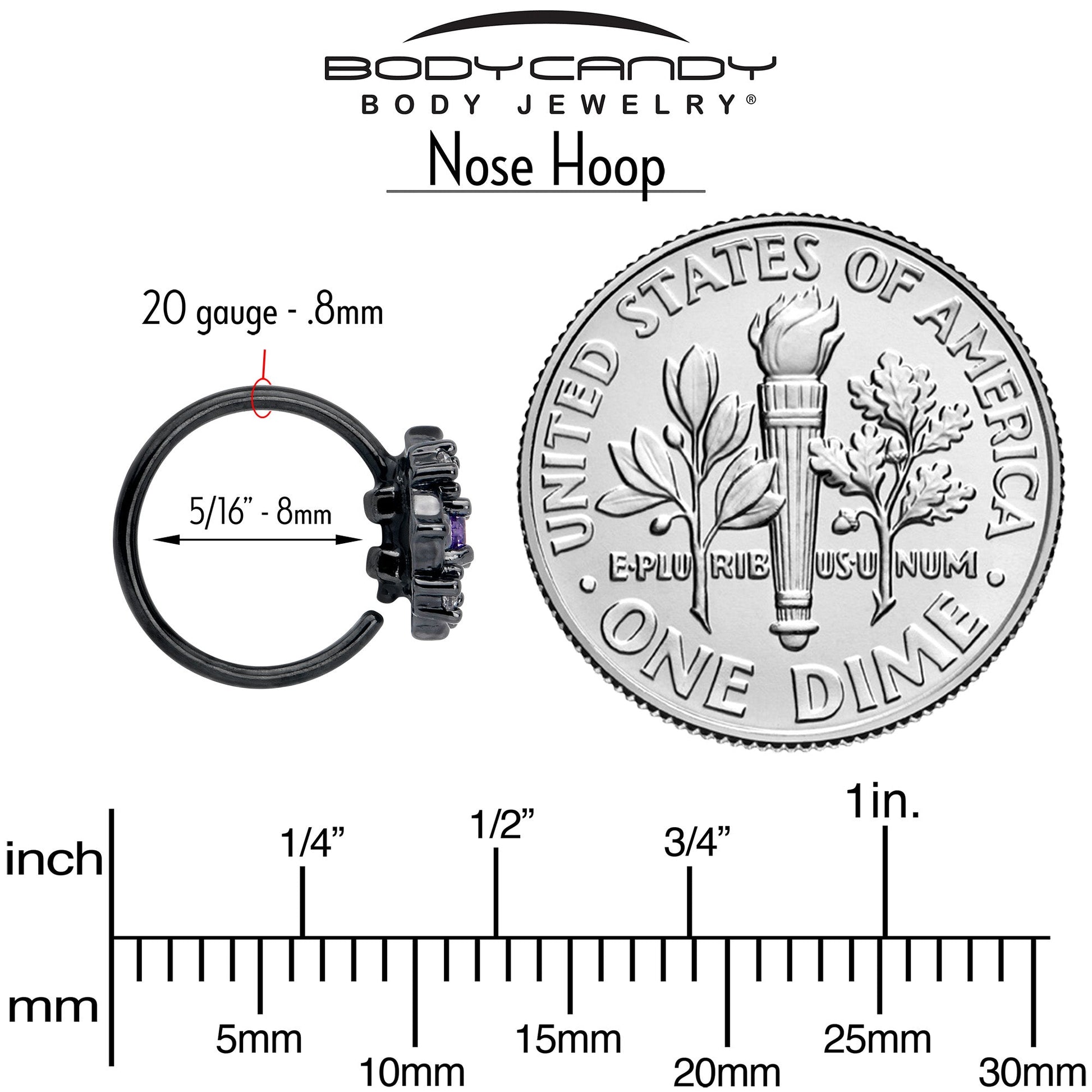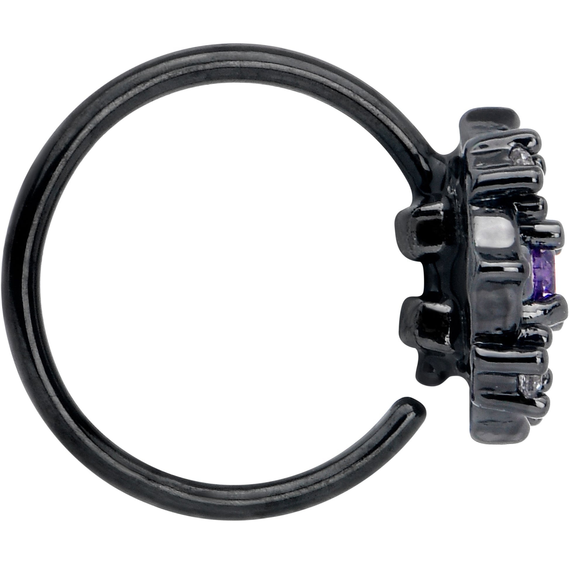 Your style will be blooming with this 20 gauge nostril ring. It's made with an 8mm black PVD over 316L surgical grade stainless steel circular ring. It features a circular flower charm with openwork petals. The flower is set with a purple cubic zirconia gem center and clear cubic zirconia gems along the outer edges. Let your look blossom with this fabulous floral nose piercing jewelry.Specifications