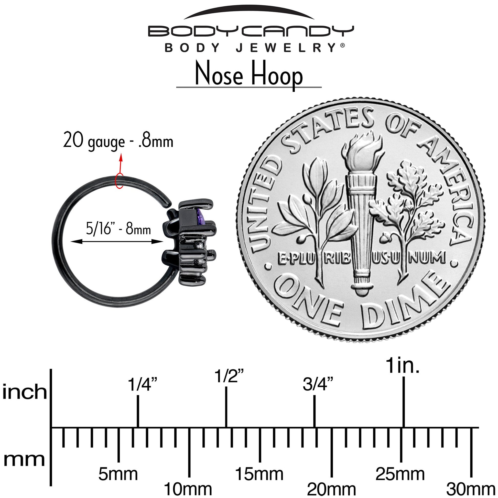 Your look is sure to be a hit when you are rocking this 20 gauge nostril jewelry. It is made with an 8mm black PVD over 316L surgical grade stainless steel circular ring. It features an elegant rhombus charm, with a purple cubic zirconia gem center and a trio of clear cubic zirconia gem embellishments for a color contrast you can not take your eyes off of. Make an impact with this elegant rhombus nose piercing jewelry.Specifications