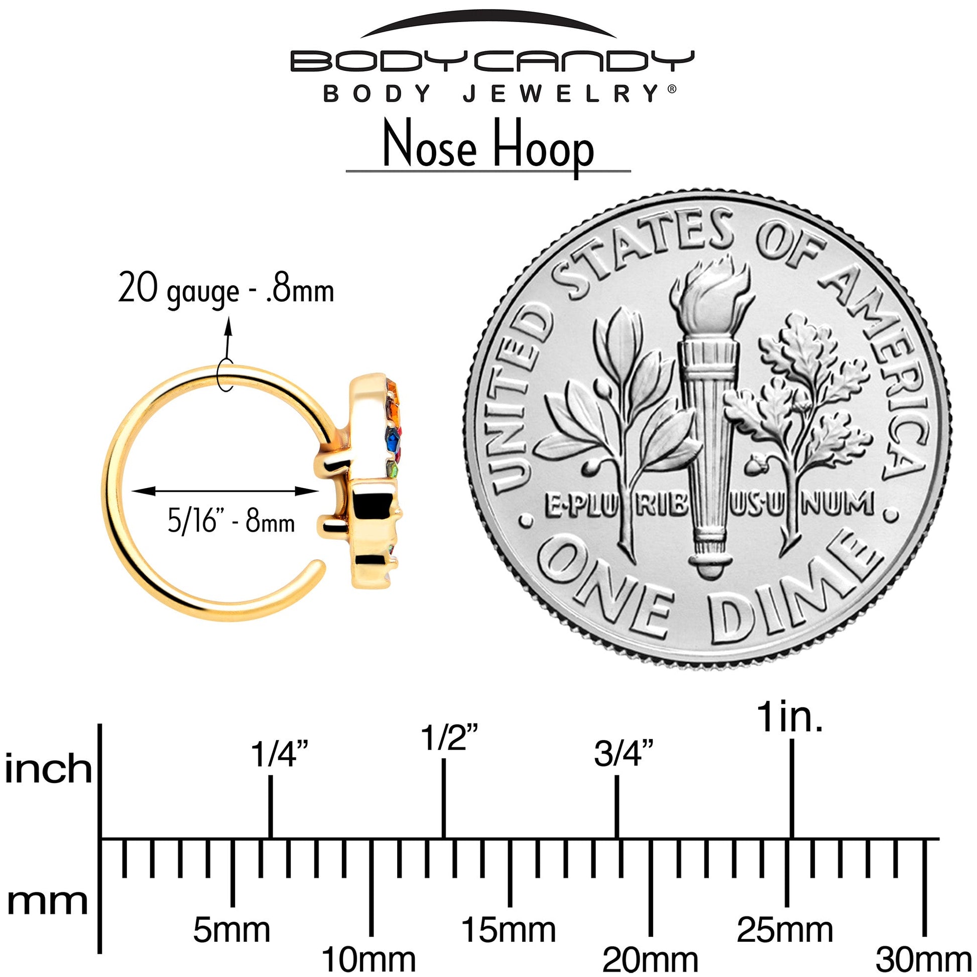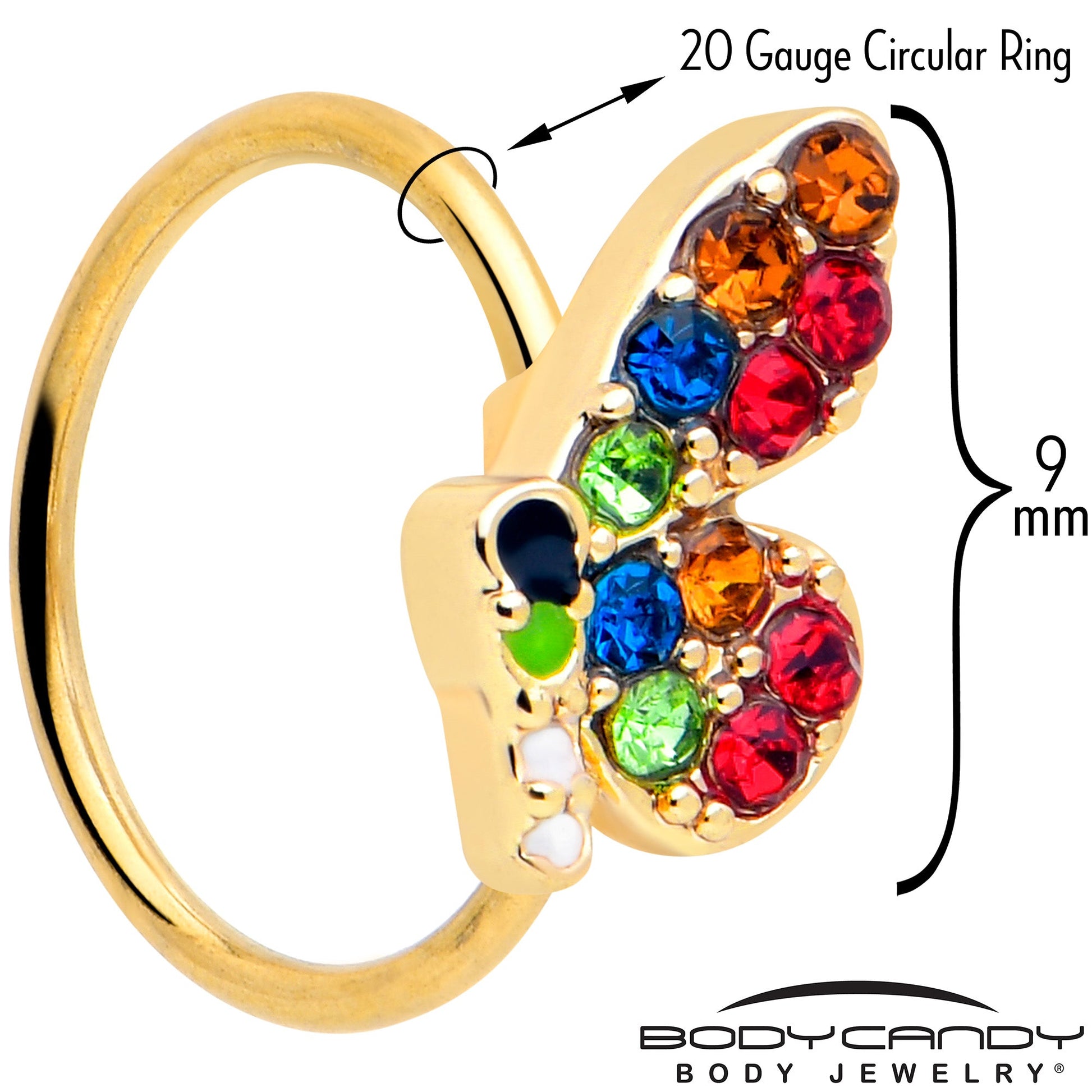 The colorful butterfly on this 20 gauge nostril ring is going to steal your heart. It is made with an 8mm gold tone PVD over 316L surgical grade stainless steel circular ring. It features a butterfly charm, embellished with multicolor gems for a truly glam style. The overall look is colorful, unique, and truly eye-catching. This is some nose piercing jewelry that will be in your heart forever.Specifications
