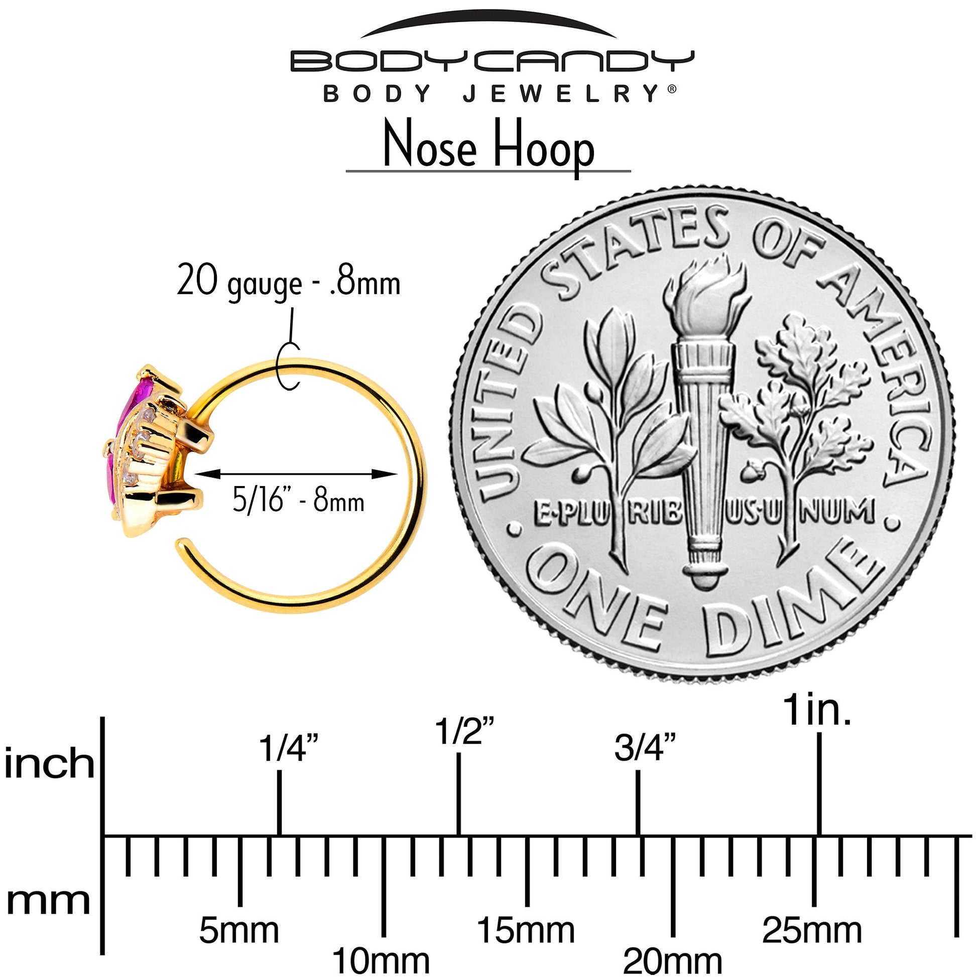 You're sure to be a fan of this 20 gauge nostril ring. It's made with an 8mm gold tone PVD over 316L surgical grade stainless steel circular ring. It features a pair of red cubic zirconia gems fanned out and set above a swirl embellishment. At the base are clear cubic zirconia gems for an added touch of style. This nose piercing jewelry has so much glamour it'll make your head swirl.Specifications