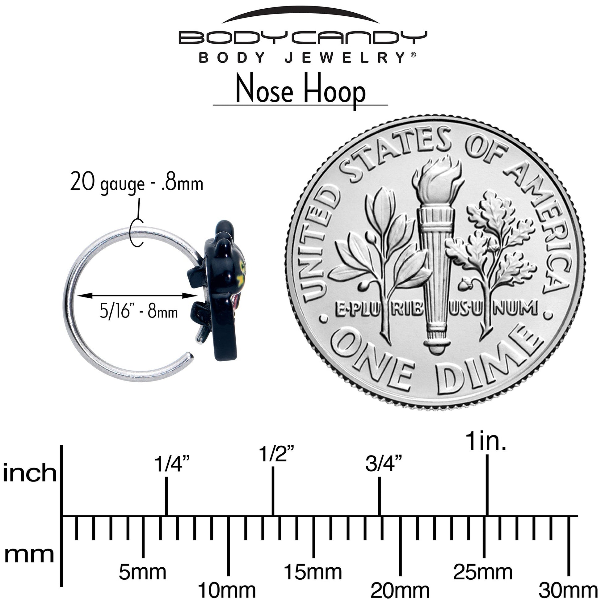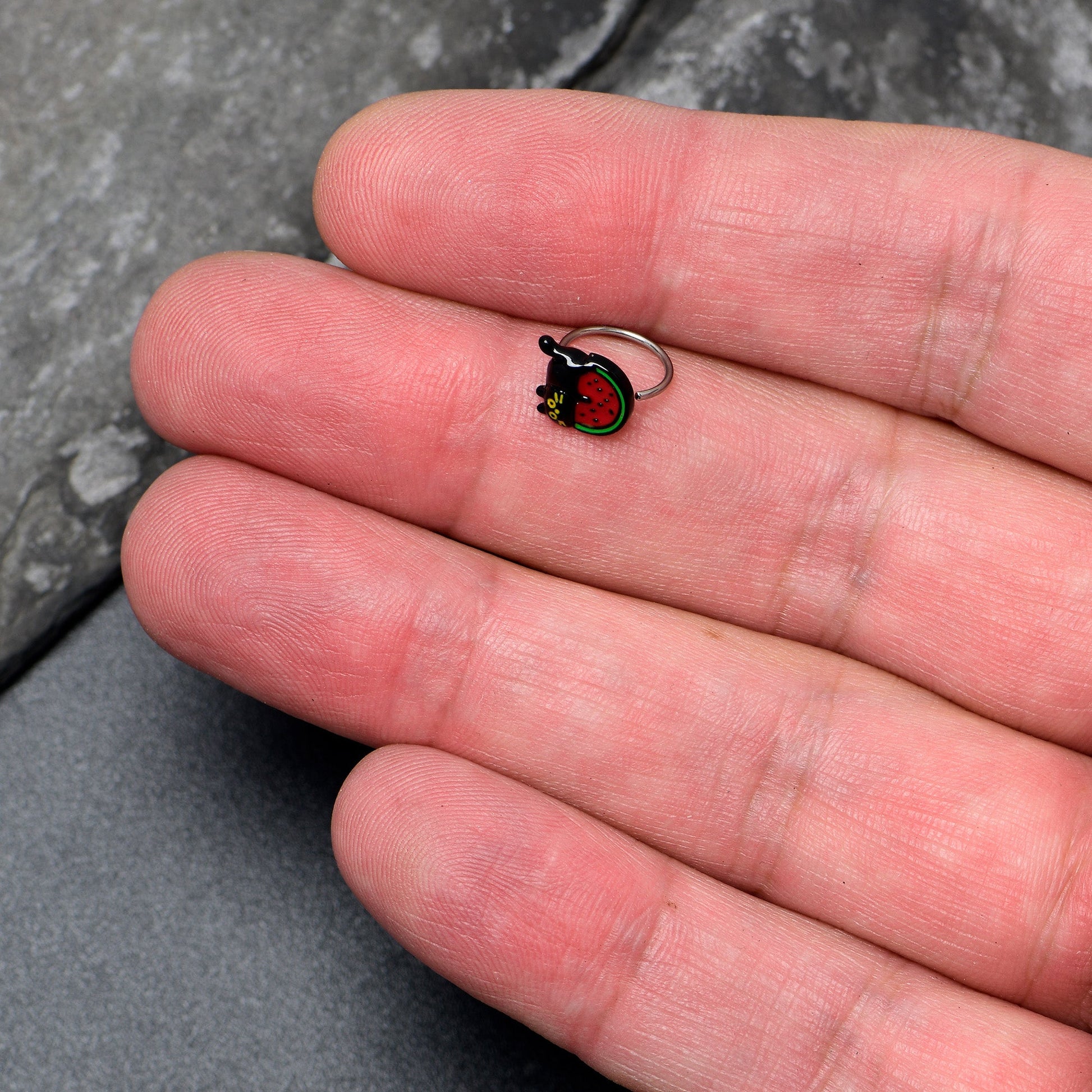 Show your love for watermelon like the peaceful cat on this 20 gauge nostril ring. It's made with an 8mm circular ring. It features a green and red watermelon charm with black seed detailing. Lounging on top of the watermelon is a black cat with yellow features and a serene expression as though dreaming of something lovely. Start a fashion revolution with the peaceful watermelon kitty on this gorgeous and inspiring nose piercing jewelry.Specifications